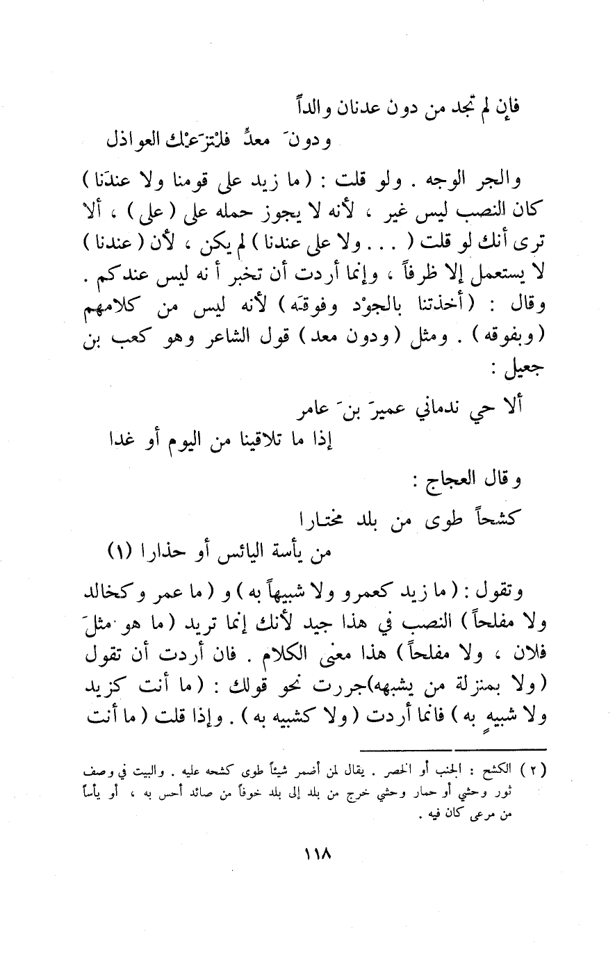 وتقول: "ما زيد كعمرو, ولا شبيها به" و"ما عمرو كخالد ولا مفلحا" النصب في هذا جيد؛ لأنك إنما تريد "ما هو مثل فلان, ولا مفلحا" هذا معنى الكلام. فإن أردت أن تقول: "ولا بمنزلة من يشبهه" جررت نحو قولك: "ما أنت كزيد, ولا شبيهٍ به" فإنما أردت "ولا كشبيه به". وإذا قلت: "ما أنت