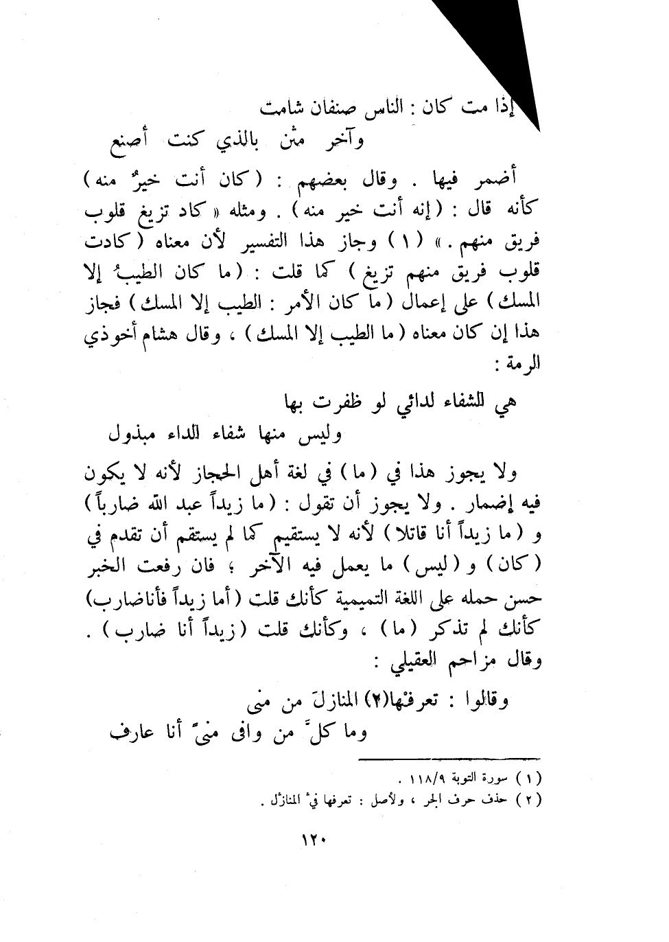 ولا يجوز هذا في "ما" في لغة أهل الحجاز؛ لأنه لا يكون فيه إضمار. ولا يجوز أن تقول: "ما زيدا عبد الله ضاربا" و"ما زيدا أنا قاتلا" لأنه لا يستقيم كما لم يستقم أن تقدم في "كان" و"ليس" ما يعمل فيه الآخر؛ فإن رفعت الخبر حسن حمله على اللغة التميمية كأنك قلت: "أما زيدا فأنا ضارب" كأنك لم تذكر "ما"، وكأنك قلت: "زيدا أنا ضارب".