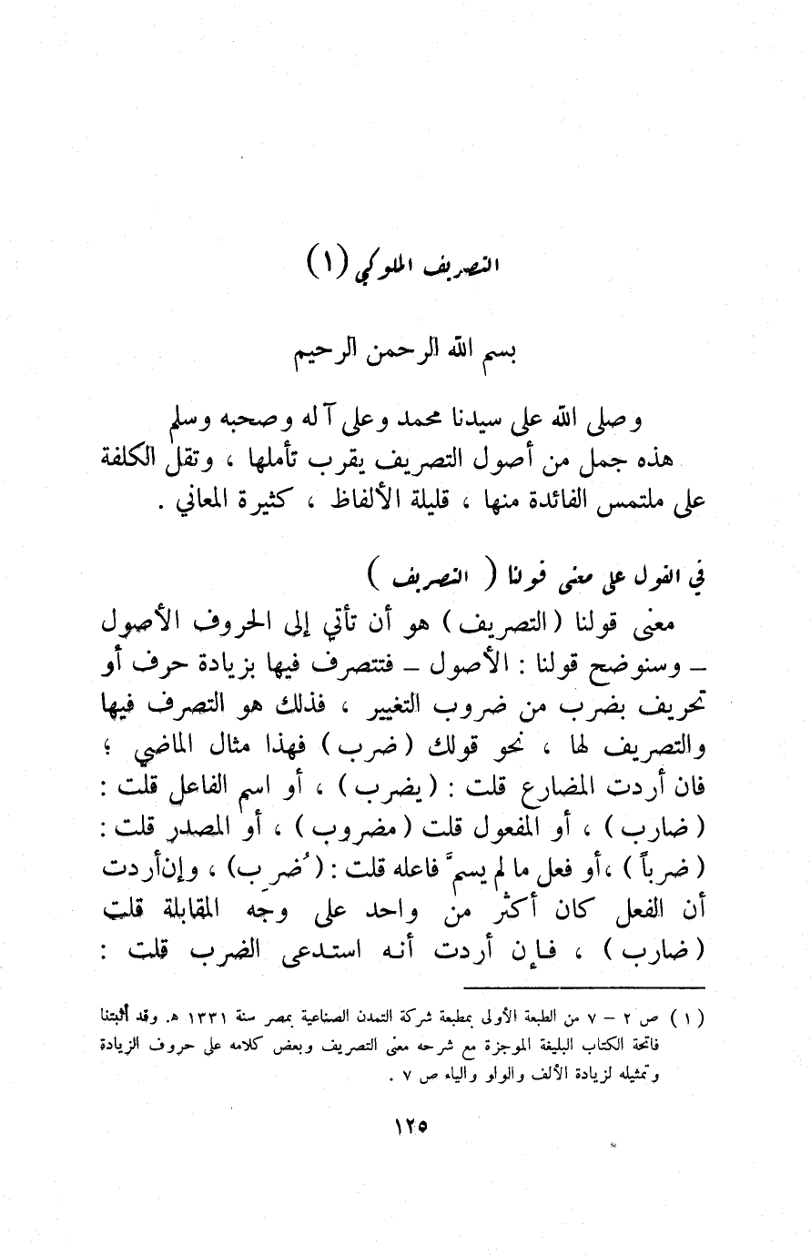 1 ص2-7 من الطبعة الأولى بمطبعة شركة التمدن الصناعية بمصر سنة 1331هـ. وقد أثبتنا فاتحة الكتاب البليغة الموجزة مع شرحه معنى التصريف, وبعض كلامه على حروف الزيادة, وتمثيله لزيادة الألف والواو والياء ص7.
