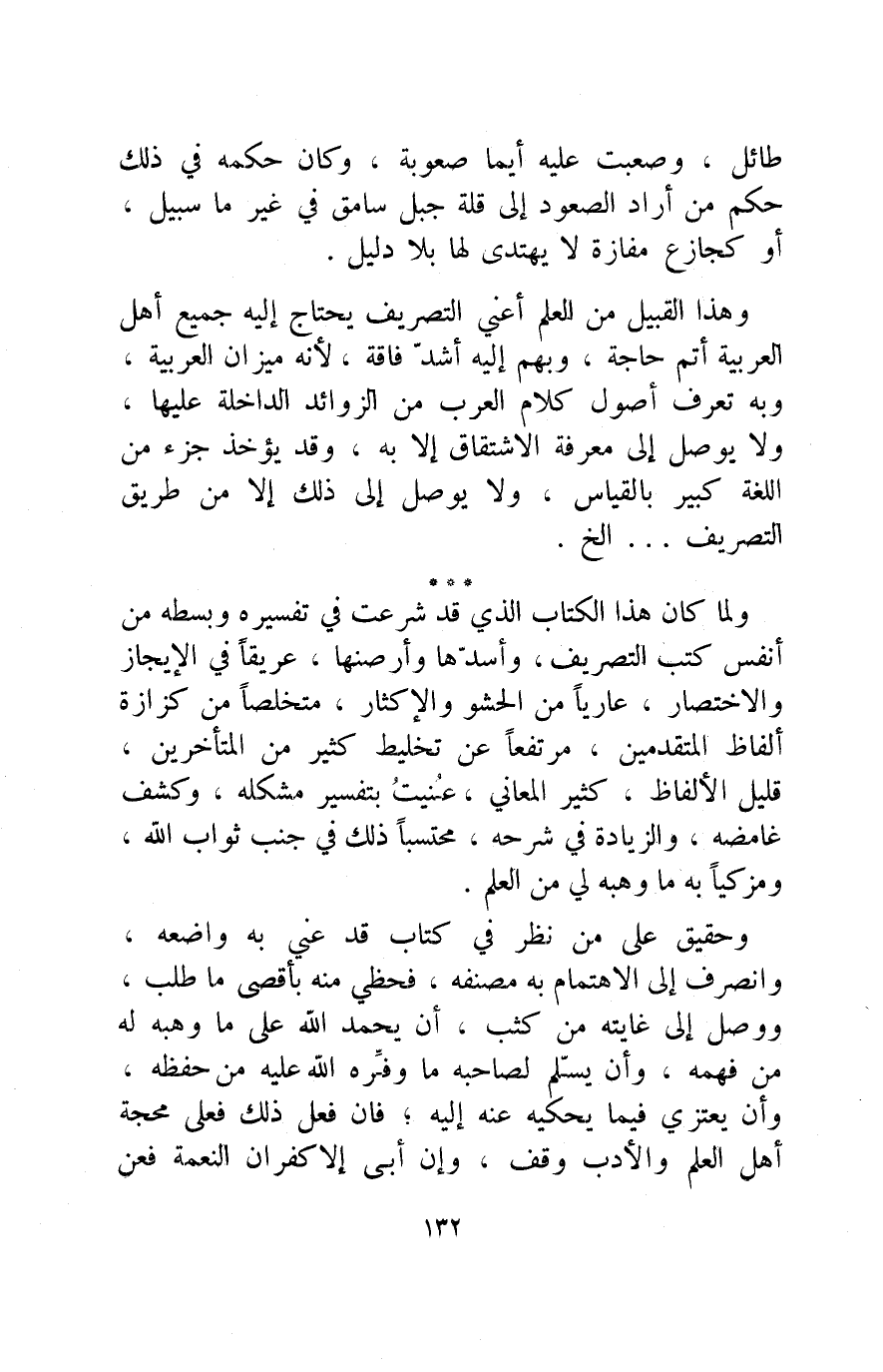 ولما كان هذا الكتاب الذي قد شرعت في تفسيره وبسطه من أنفس كتب التصريف، وأسدها وأرصنها، عريقا في الإيجاز والاختصار، عاريا من الحشو والإكثار، متخلصا من كزازة ألفاظ المتقدمين، مرتفعا عن تخليط كثير من المتأخرين، قليل الألفاظ، كثير المعاني، عُنيت بتفسير مشكله، وكشف غامضه، والزيادة في شرحه، محتسبا ذلك في جنب ثواب الله، ومزكيا به ما وهبه لي من العلم.