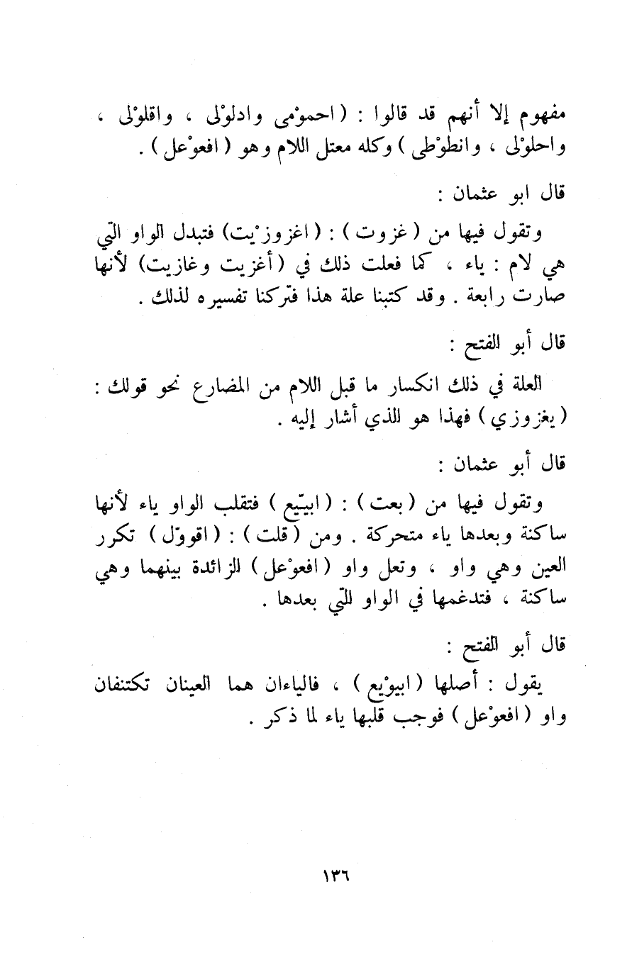 وتقول فيها من "غزوت": "اغزوزيت" فتبدل الواو التي هي لام ياء، كما فعلت ذلك في "أغزيت وغازيت" لأنها صارت رابعة. وقد كتبنا علة هذا فتركنا تفسيره لذلك.
