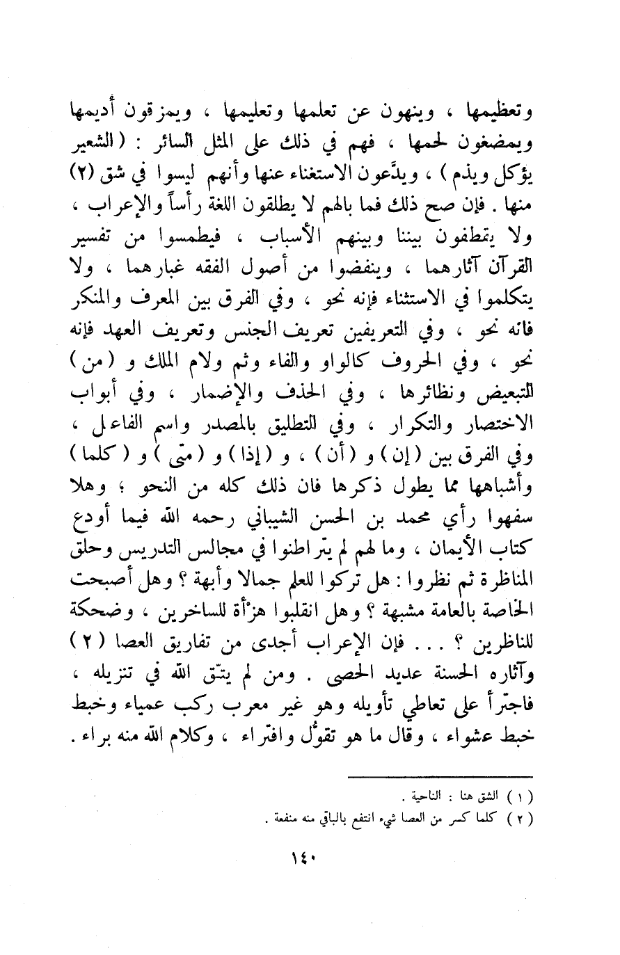وتعظيمها، وينهون عن تعلمها وتعليمها، ويمزقون أديمها ويمضغون لحمها، فهم في ذلك على المثل السائر: "الشعير يؤكل ويذم"، ويدَّعون الاستغناء عنها وأنهم ليسوا في شق1 منها. فإن صح ذلك فما بالهم لا يطلقون اللغة رأسا والإعراب، ولا يقطفون بيننا وبينهم الأسباب، فيطمسوا من تفسير القرآن آثارهما، وينفضوا من أصول الفقه غبارهما، ولا يتكلموا في الاستثناء فإنه نحو، وفي الفرق بين المعرف والمنكر فإنه نحو، وفي التعريفين تعريف الجنس وتعريف العهد فإنه نحو، وفي الحروف كالواو والفاء وثم ولام الملك و"من" للتبعيض ونظائرها، وفي الحذف والإضمار، وفي أبواب الاختصار والتكرار، وفي التطليق بالمصدر واسم الفاعل، وفي الفرق بين "إن" و"أن"، و"إذا" و"متى" و"كلما" وأشباهها مما يطول ذكرها, فإن ذلك كله من النحو؛ وهلا سفهوا رأي محمد بن الحسن الشيباني -رحمه الله- فيما أودع كتاب الأيمان, وما لهم لم يتراطنوا في مجالس التدريس وحلق المناظرة ثم نظروا: هل تركوا للعلم جمالا وأبهة؟ وهل أصبحت الخاصة بالعامة مشبهة؟ وهل انقلبوا هزأة للساخرين، وضحكة للناظرين؟ فإن الإعراب أجدى من تفاريق العصا2 وآثاره الحسنة عديدة الحصى. ومن لم يتق الله في تنزيله، فاجترأ على تعاطي تأويله وهو غير معرب ركب عمياء وخبط خبط عشواء، وقال ما هو تقول وافتراء، وكلام الله منه براء.
