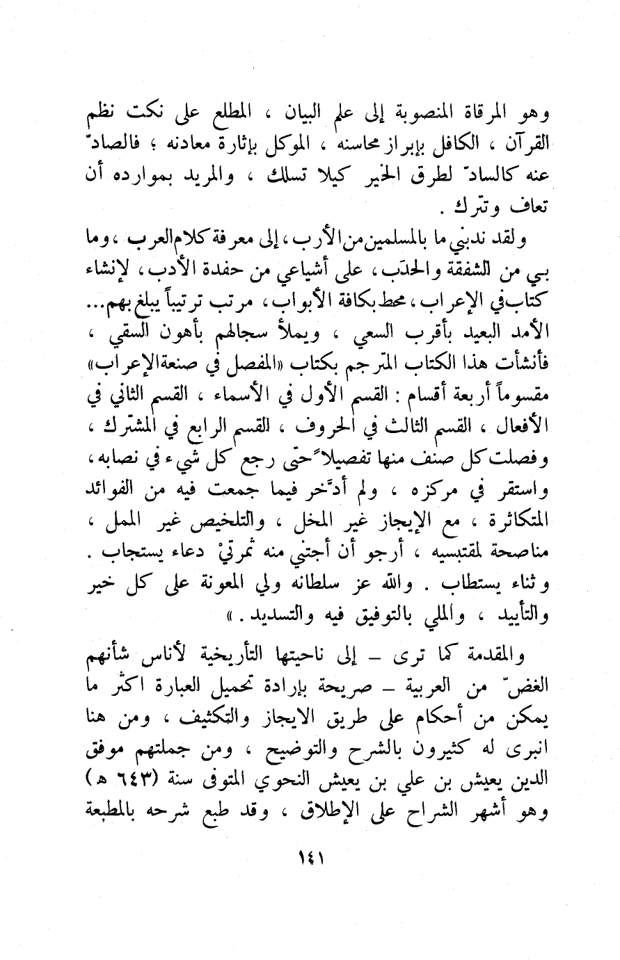 ولقد ندبني ما بالمسلمين من الأرب، إلى معرفة كلام العرب، وما بي من الشفقة والحدَب، على أشياعي من حفدة الأدب؛ لإنشاء كتاب في الإعراب، محط بكافة الأبواب، مرتب ترتيبا يبلغ بهم ... الأمد البعيد بأقرب السعي، ويملأ سجالهم بأهون السقي، فأنشأت هذا الكتاب المترجم بكتاب "المفصل في صنعة الإعراب" مقسوما أربعة أقسام: القسم الأول في الأسماء، القسم الثاني في الأفعال، القسم الثالث في الحروف، القسم الرابع في المشترك، وفصلت كل صنف منها تفصيلا حتى رجع كل شيء في نصابه، واستقر في مركزه، ولم أدّخر فيما جمعت فيه من الفوائد المتكاثرة، مع الإيجاز غير المخلّ، والتلخيص غير المملّ، مناصحة لمقتبسيه، أرجو أن أجتني منه ثمرتي دعاء يستجاب وثناء يستطاب. والله -عز سلطانه- ولي المعونة على كل خير والتأييد، والملي بالتوفيق فيه والتسديد".