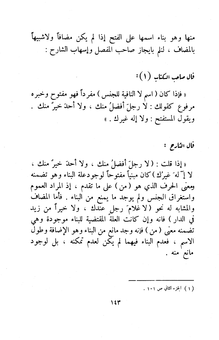 "إذا قلت: "لا رجلَ أفضلُ منك، ولا أحد خير منك, ولا إله غيرك" كان مبنيا مفتوحا لوجود علة البناء وهو تضمنه معنى الحرف الذي هو "من" على ما تقدم، إذ المراد العموم واستغراق الجنس ولم يوجد ما يمنع من البناء. فأما المضاف والمشابه له نحو "لا غلامَ رجلٍ عندك، ولا خيرًا من زيد في الدار" فإنه وإن كانت العلة المقتضية للبناء موجودة وهي تضمنه معنى "من" فإنه وجد مانع من البناء وهو الإضافة وطول الاسم، فعدم البناء فيهما لم يكن لعدم تمكنه، بل لوجود مانع منه".
