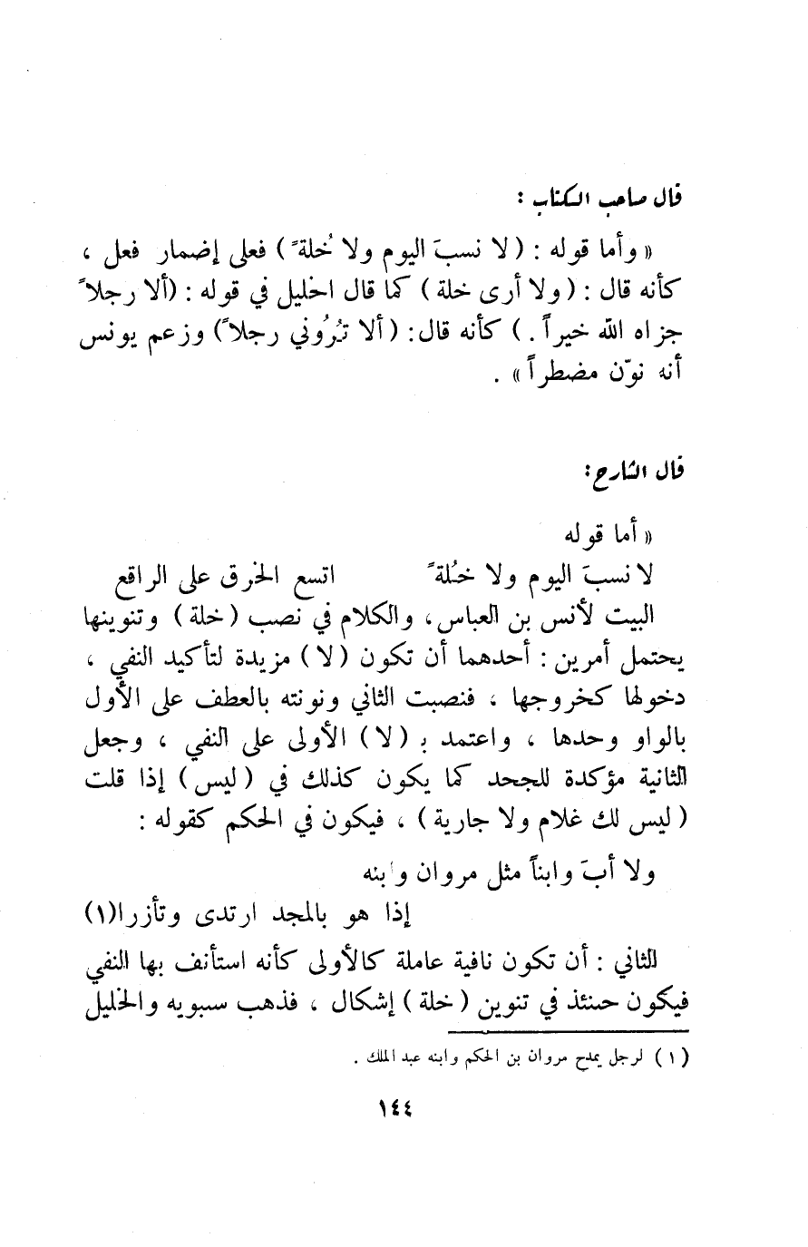 البيت لأنس بن العباس، والكلام في نصب "خلة" وتنوينها يحتمل أمرين: أحدهما أن تكون "لا" مزيدة لتأكيد النفي، دخولها كخروجها، فنصبت الثاني ونونته بالعطف على الأول بالواو وحدها، واعتمد بـ "لا" الأولى على النفي، وجعل الثانية مؤكدة للجحد كما يكون كذلك في "ليس" إذا قلت: "ليس لك غلام ولا جارية"، فيكون في الحكم كقوله: