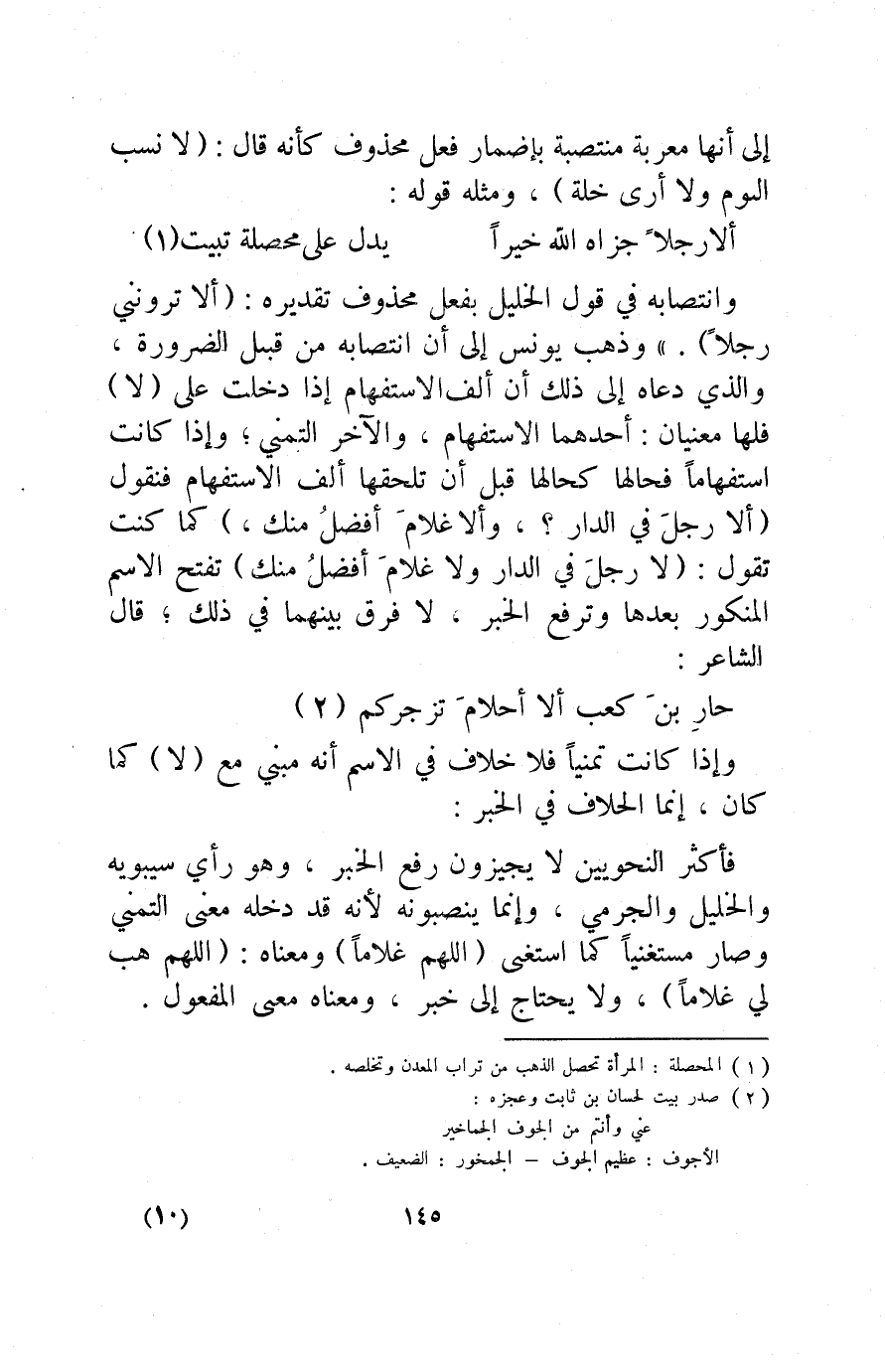 وانتصابه في قول الخليل بفعل محذوف تقديره: "ألا ترونني رجلا". وذهب يونس إلى أن انتصابه من قبيل الضرورة، والذي دعاه إلى ذلك أن ألف الاستفهام إذا دخلت على "لا" فلها معنيان: أحدهما الاستفهام، والآخر التمني؛ وإذا كانت استفهاما فحالها كحالها قبل أن تلحقها ألف الاستفهام فنقول: "ألا رجلَ في الدار؟ , وألا غلام أفضل منك؟ " كما كنت تقول: "لا رجل في الدار، ولا غلام أفضل منك" تفتح الاسم المنكور بعدها وترفع الخبر، لا فرق بينهما في ذلك، قال الشاعر: