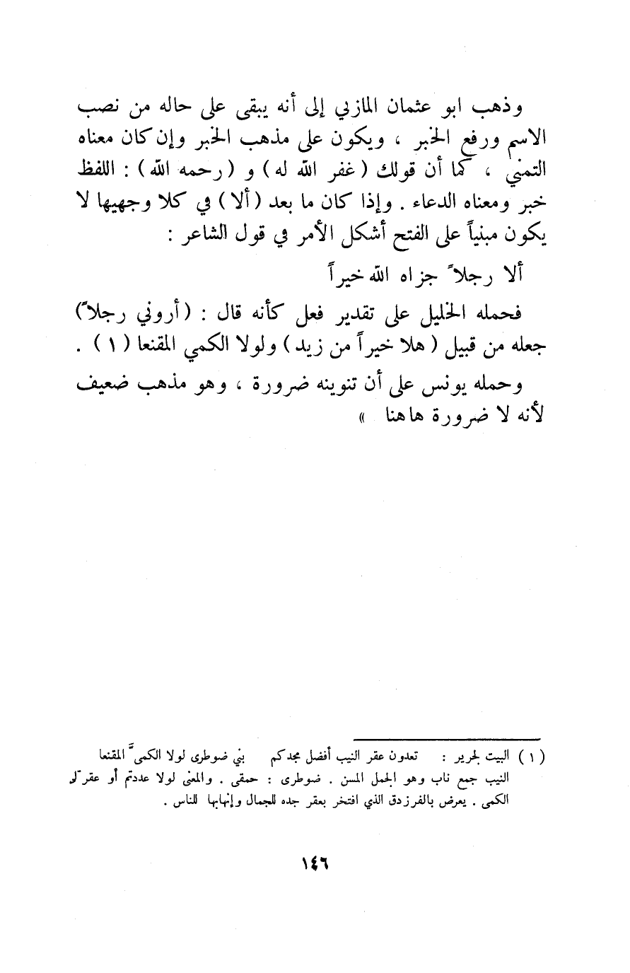 وذهب أبو عثمان المازني إلى أنه يبقى على حاله من نصب الاسم ورفع الخبر، ويكون على مذهب الخبر وإن كان معناه التمني، كما أن قولك: "غفر الله له" و"رحمه الله" اللفظ خبر ومعناه الدعاء. وإذا كان ما بعد "ألا" في كلا وجهيها لا يكون مبنيا على الفتح أشكل الأمر في قول الشاعر: