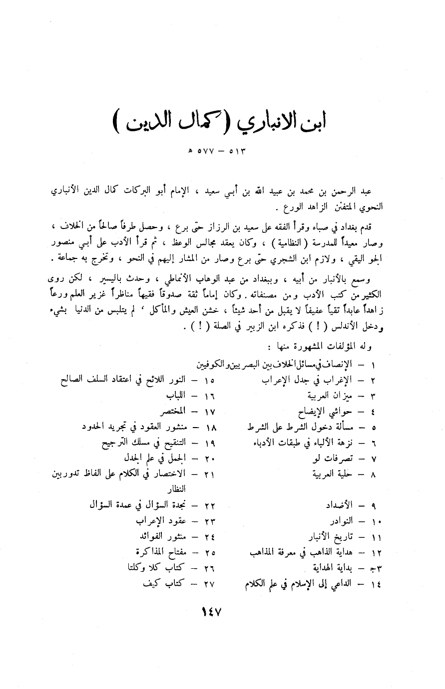 عبد الرحمن بن محمد بن عبيد الله بن أبي سعيد، الإمام أبو البركات كمال الدين الأنباري النحوي المتفنن, الزاهد الورع.