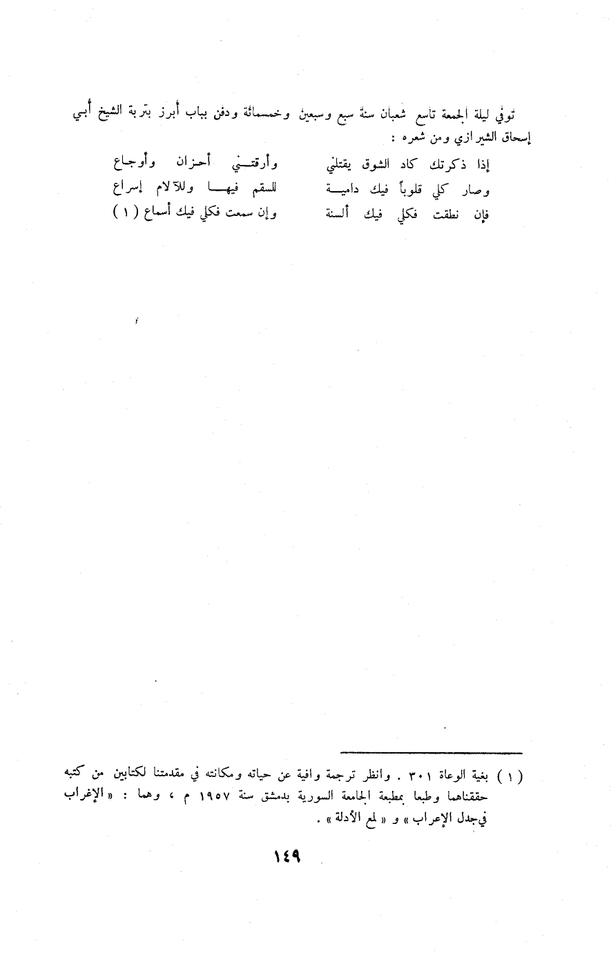 1 بغية الوعاة 301. وانظر ترجمة وافية عن حياته ومكانته في مقدمتنا لكتابين من كتبه حققناهما, وطبعا بمطبعة الجامعة السورية بدمشق سنة 1957م، وهما: "الإغراب في جدل الإعراب" و"لمع الأدلة".