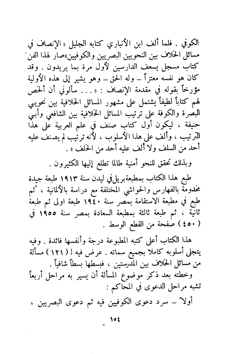 الكوفي. فلما ألف ابن الأنباري كتابه الجليل "الإنصاف في مسائل الخلاف بين النحويين البصريين والكوفيين" صار لهذا الفن كتاب مسجل يسعف الدارسين لأول مرة بما يريدون. وقد كان هو نفسه معتزا -وله الحق- وهو يشير إلى هذه الأولية مؤرخا بقوله في مقدمة الإنصاف: "سألوني أن ألخص لهم كتابا لطيفا يشتمل على مشهور المسائل الخلافية بين نحويي البصرة والكوفة على ترتيب المسائل الخلافية بين الشافعي وأبي حنيفة، ليكون أول كتاب صنف في علم العربية على هذا الترتيب، وألف على هذا الأسلوب؛ لأنه ترتيب لم يصنف عليه أحد من السلف ولا ألف عليه أحد من الخلف".