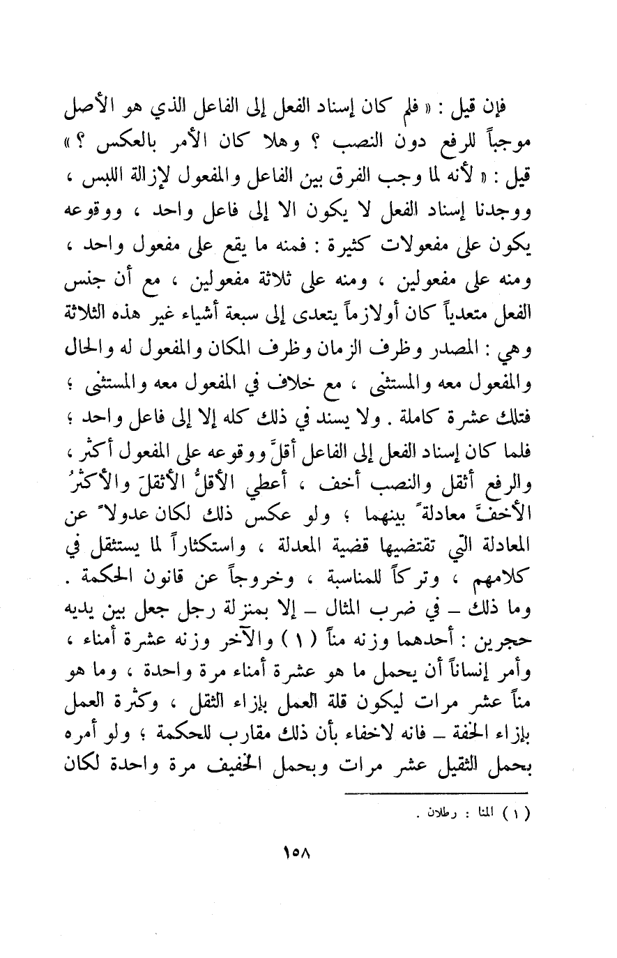 فإن قيل: "فلم كان إسناد الفعل إلى الفاعل الذي هو الأصل موجبا للرفع دون النصب؟ وهلا كان الأمر بالعكس؟ " قيل: "لأنه لما وجب الفرق بين الفاعل والمفعول لإزالة اللبس، ووجدنا إسناد الفعل لا يكون إلا إلى فاعل واحد، ووقوعه يكون على مفعولات كثيرة: فمنه ما يقع على مفعول واحد، ومنه على مفعولين، ومنه على ثلاثة مفعولين، مع أن جنس الفعل متعديا كان أو لازما يتعدى إلى سبعة أشياء غير هذه الثلاثة وهي: المصدر وظرف الزمان وظرف المكان والمفعول له والحال والمفعول معه والمستثنى، مع خلاف في المفعول معه والمستثنى؛ فتلك عشرة كاملة. ولا يسند في ذلك كله إلا إلى فاعل واحد؛ فلما كان إسناد الفعل إلى الفاعل أقل ووقوعه على المفعول أكثر، والرفع أثقل والنصب أخف، أعطي الأقل الأثقل والأكثر الأخف معادلة بينهما؛ ولو عكس ذلك لكان عدولا عن المعادلة التي تقتضيها قضية المعدلة، واستكثارا لما يستثقل في كلامهم، وتركا للمناسبة، وخروجا عن قانون الحكمة. وما ذلك -في ضرب المثال- إلا بمنزلة رجل جعل بين يديه حجرين: أحدهما وزنه منا1 والآخر وزنه عشرة أمناء، وأمر إنسانا أن يحمل ما هو عشرة أمناء مرة واحدة، وما هو منا عشر مرات ليكون قلة العمل بإزاء الثقل، وكثرة العمل بإزاء الخفة, فإنه لا خفاء بأن ذلك مقارب للحكمة؛ ولو أمره بحمل الثقيل عشر مرات وبحمل الخفيف مرة واحدة لكان