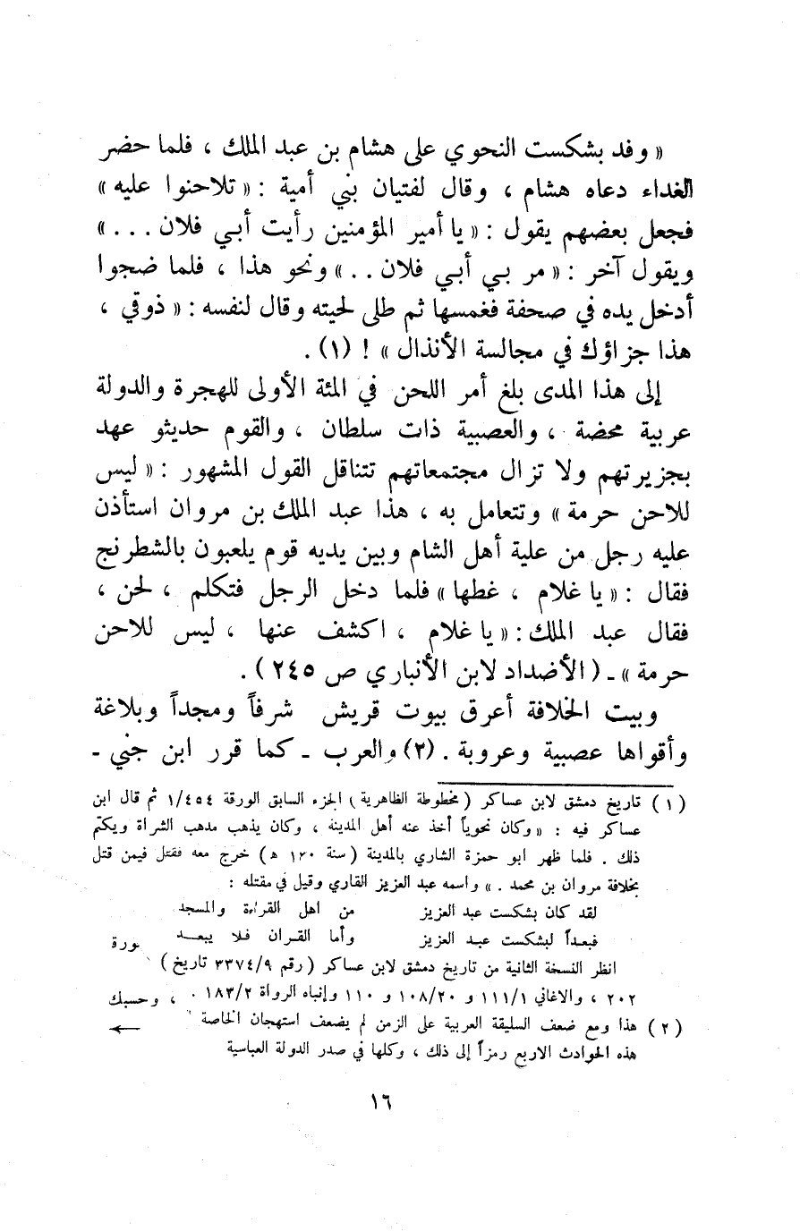 إلى هذا المدى بلغ أمر اللحن في المائة الأولى للهجرة والدولة عربية محضة، والعصبية ذات سلطان، والقوم حديثو عهد بجزيرتهم ولا تزال مجتمعاتهم تتناقل القول المشهور: "ليس للاحن حرمة" وتتعامل به، هذا عبد الملك بن مروان استأذن عليه رجل من عِلْية أهل الشام وبين يديه قوم يلعبون بالشطرنج فقال: "يا غلام، غطها" فلما دخل الرجل فتكلم لحن، فقال عبد الملك: "يا غلام، اكشف عنها، ليس للاحن حرمة". "الأضداد لابن الأنباري ص245".