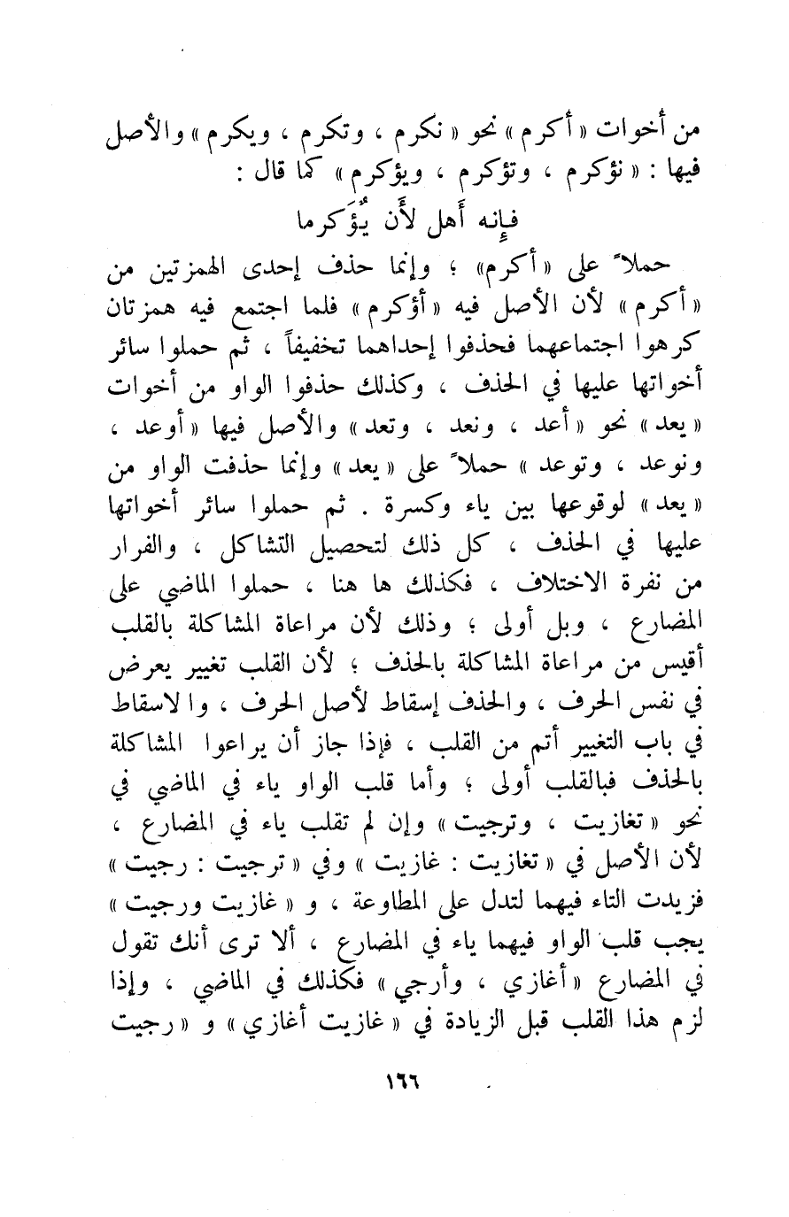 حملا على "أكرم"؛ وإنما حذف إحدى الهمزتين من "أكرم" لأن الأصل فيه "أؤكرم" فلما اجتمع فيه همزتان كرهوا اجتماعهما فحذفوا إحداهما تخفيفا، ثم حملوا سائر أخواتها عليها في الحذف، وكذلك حذفوا الواو من أخوات "يعد" نحو "أعد، ونعد، وتعد" والأصل فيها "أوعد، ونوعد، وتوعد" حملا على "يعد" وإنما حذفت الواو من "يعد" لوقوعها بين ياء وكسرة. ثم حملوا سائر أخواتها عليها في الحذف, كل ذلك لتحصيل التشاكل, والفرار من نفرة الاختلاف، فكذلك ههنا، حملوا الماضي على المضارع، وبل أولى؛ وذلك لأن مراعاة المشاكلة بالقلب أقيس من مراعاة المشاكلة بالحذف؛ لأن القلب تغيير يعرض في نفس الحرف، والحذف إسقاط لأصل الحرف، والإسقاط في باب التغيير أتم من القلب، فإذا جاز أن يراعوا المشاكلة بالحذف فبالقلب أولى؛ وأما قلب الواو ياء في الماضي في نحو "تغازيت، وترجيت" وإن لم تقلب ياء في المضارع؛ لأن الأصل في "تغازيت: غازيت" وفي "ترجيت: رجيت" فزيدت التاء فيهما لتدل على المطاوعة، و"غازيت, ورجيت" يجب قلب الواو فيهما ياء في المضارع، ألا ترى أنك تقول في المضارع "أغازي، وأرجي" فكذلك في الماضي، وإذا لزم هذا القلب قبل الزيادة في "غازيت أغازي" و"رجيت