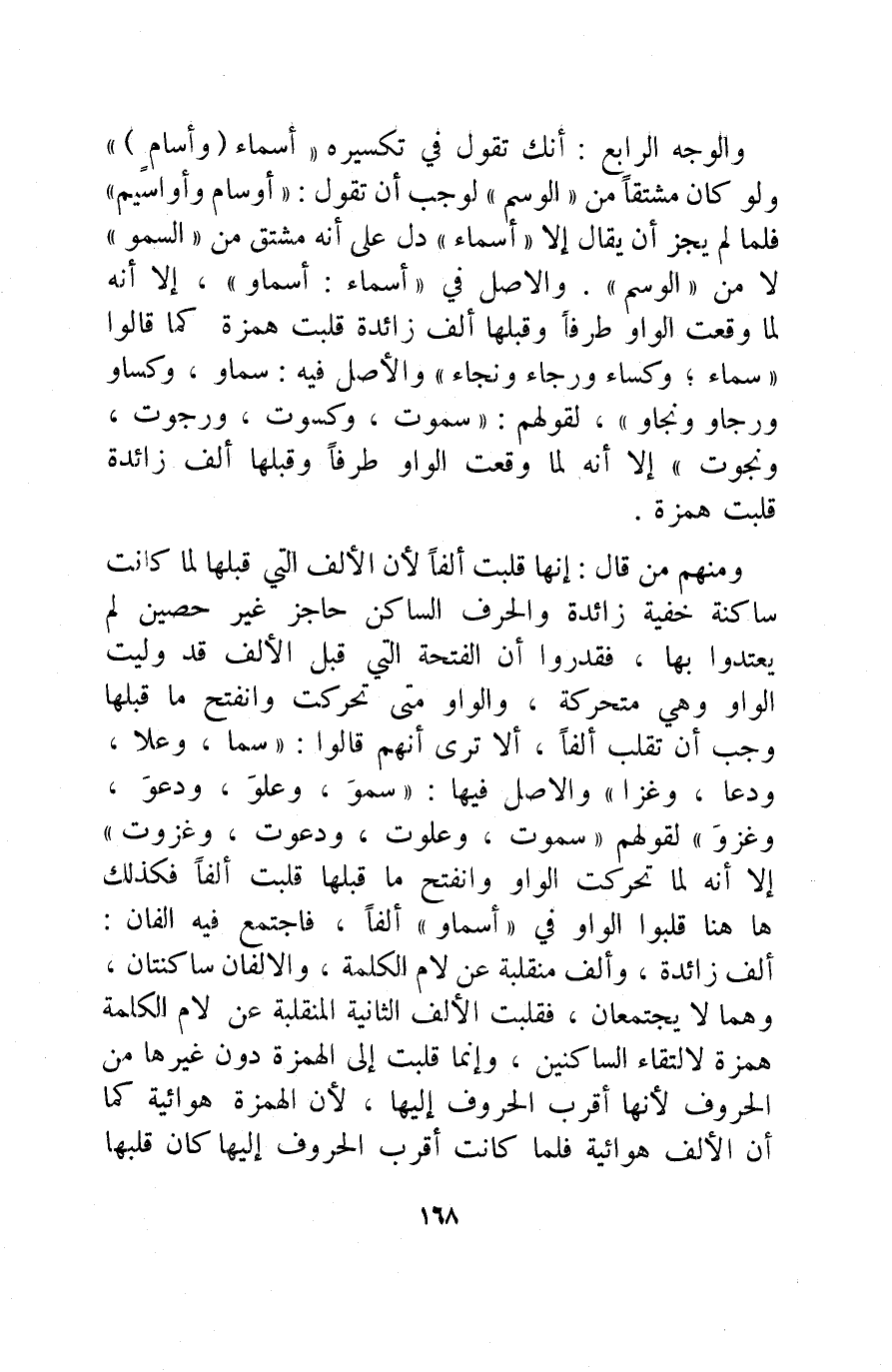 ومنهم من قال: إنها قلبت ألفا؛ لأن الألف التي قبلها لما كانت ساكنة خفية زائدة, والحرف الساكن حاجز غير حصين لم يعتدوا بها، ففدروا أن الفتحة التي قبل الألف قد وليت الواو وهي متحركة، والواو متى تحركت وانفتح ما قبلها وجب أن تقلب ألفا، ألا ترى أنهم قالوا: "سما، وعلا، ودعا، وغزا" والأصل فيها: "سموَ، وعلوَ، ودعو، وغزو" لقولهم: "سموت، وعلوت، ودعوت، وغزوت" إلا أنه لما تحركت الواو وانفتح ما قبلها قلبت ألفا فكذلك ههنا قلبوا الواو في "أسماو" ألفا، فاجتمع فيه ألفان: ألف زائدة، وألف منقلبة عن لام الكلمة، والألفان ساكنتان، وهما لا يجتمعان، فقلبت الألف الثانية المنقلبة عن لام الكلمة همزة لالتقاء الساكنين، وإنما قلبت إلى الهمزة دون غيرها من الحروف لأنها أقرب الحروف إليها؛ لأن الهمزة هوائية كما أن الألف هوائية, فلما كانت أقرب الحروف إليها كان قلبها