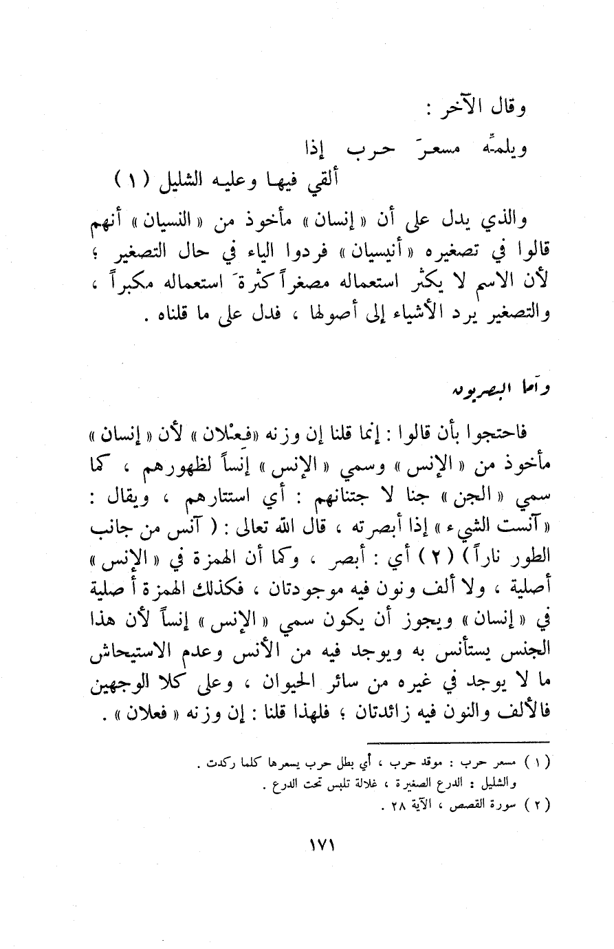 فاحتجوا بأن قالوا: إنما قلنا: إن وزنه "فِعْلان" لأن "إنسان" مأخوذ من "الإنس" وسمي "الإنس" إنسا لظهورهم، كما سمي "الجن" جنا لاجتنانهم أي: استتارهم، ويقال: "آنست الشيء" إذا أبصرته، قال الله تعالى: {آنَسَ مِنْ جَانِبِ الطُّورِ نَارًا} 2 أي: أبصر، وكما أن الهمزة في "الإنس" أصلية, ولا ألف ونون فيه موجودتان, فكذلك الهمزة أصلية في "إنسان" ويجوز أن يكون سمي "الإنس" إنسا؛ لأن هذا الجنس يستأنس به ويوجد فيه من الأنس وعدم الاستيحاش ما لا يوجد في غيره من سائر الحيوان، وعلى كلا الوجهين فالألف والنون فيه زائدتان؛ فلهذا قلنا: إن وزنه "فعلان".