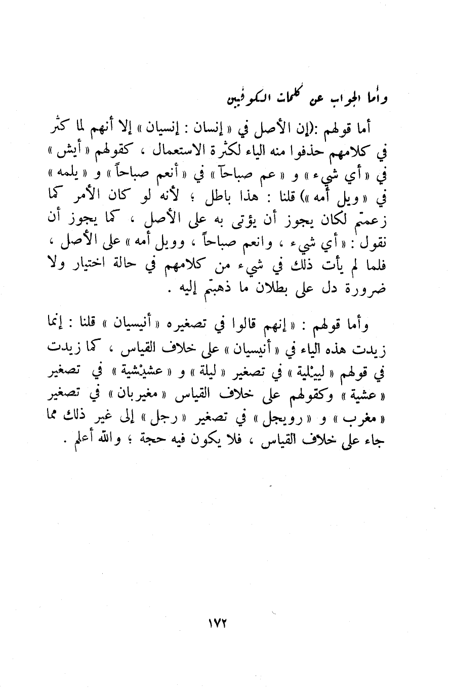 أما قولهم: "إن الأصل في "إنسان: إنسيان" إلا أنهم لما كثر في كلامهم حذفوا منه الياء لكثرة الاستعمال، كقولهم: "أيش" في "أي شيء" و"عم صباحا" في "أنعم صباحا" و"يلمه" في "ويل أمه" قلنا: هذا باطل؛ لأنه لو كان الأمر كما زعمتم لكان يجوز أن يؤتى به على الأصل، كما يجوز أن نقول: "أي شيء، وأنعم صباحا، وويل أمه" على الأصل، فلما لم يأت ذلك في شيء من كلامهم في حالة اختيار, ولا ضرورة دل على بطلان ما ذهبتم إليه.