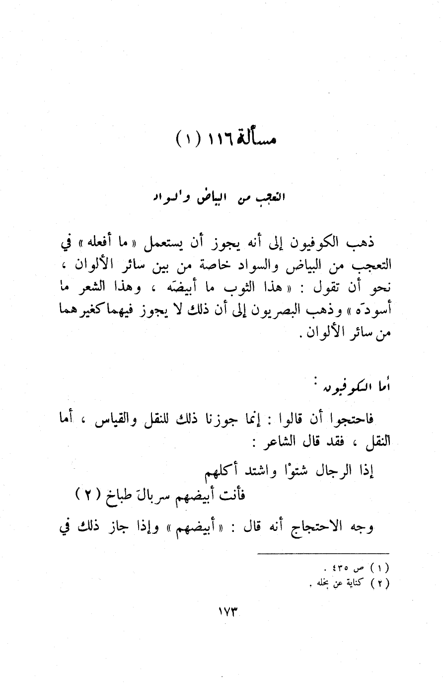 ذهب الكوفيون إلى أنه يجوز أن يستعمل "ما أفعله" في التعجب من البياض والسواد خاصة من بين سائر الألوان، نحو أن تقول: "هذا الثوب ما أبيضَهُ، وهذا الشعر ما أسودَهُ" وذهب البصريون إلى أن ذلك لا يجوز فيهما كغيرهما من سائر الألوان.