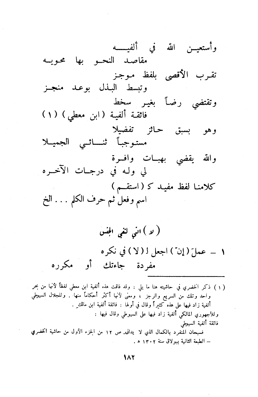 1 ذكر الخضري في حاشيته هنا ما يلي: وقد فاقت هذه ألفية ابن معطي لفظا؛ لأنها من بحر واحد وتلك من السريع والرجز، ولأنها أكثر أحكاما منها. وللجلال السيوطي ألفية زاد فيها على هذه كثيرا وقال في أولها: فائقة ألفية ابن مالك.