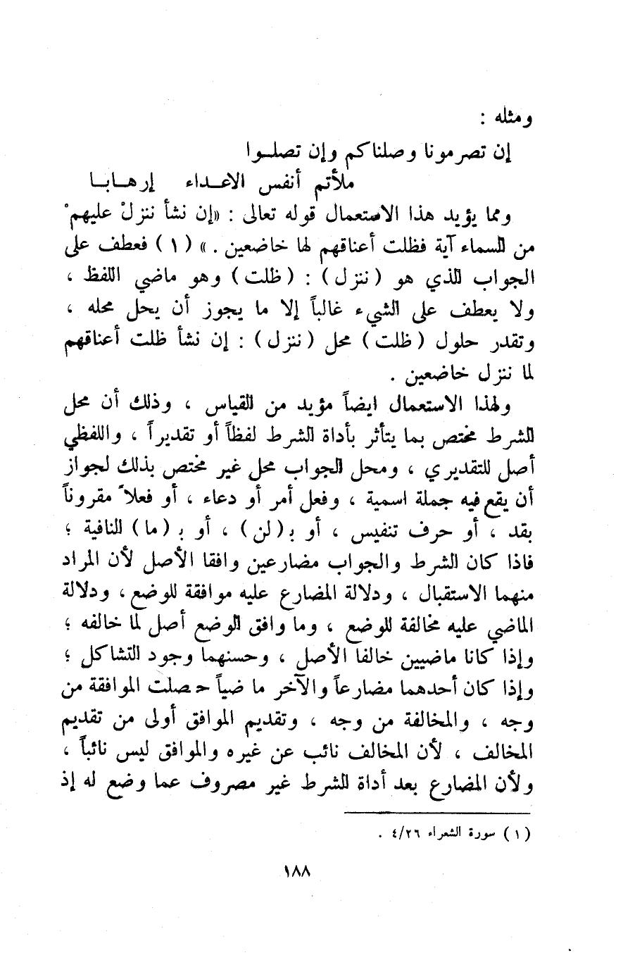 ومما يؤيد هذا الاستعمال قوله تعالى: {إِنْ نَشَأْ نُنَزِّلْ عَلَيْهِمْ مِنَ السَّمَاءِ آيَةً فَظَلَّتْ أَعْنَاقُهُمْ لَهَا خَاضِعِينَ} 1 فعطف على الجواب الذي هو {نُنَزِّلْ} : {فَظَلَّتْ} وهو ماضى اللفظ، ولا يعطف على الشيء غالبا إلا ما يجوز أن يحل محله، وتقدر حلول "ظلت" محل "ننزل": إن نشأ ظلت أعناقهم لما ننزل خاضعين.