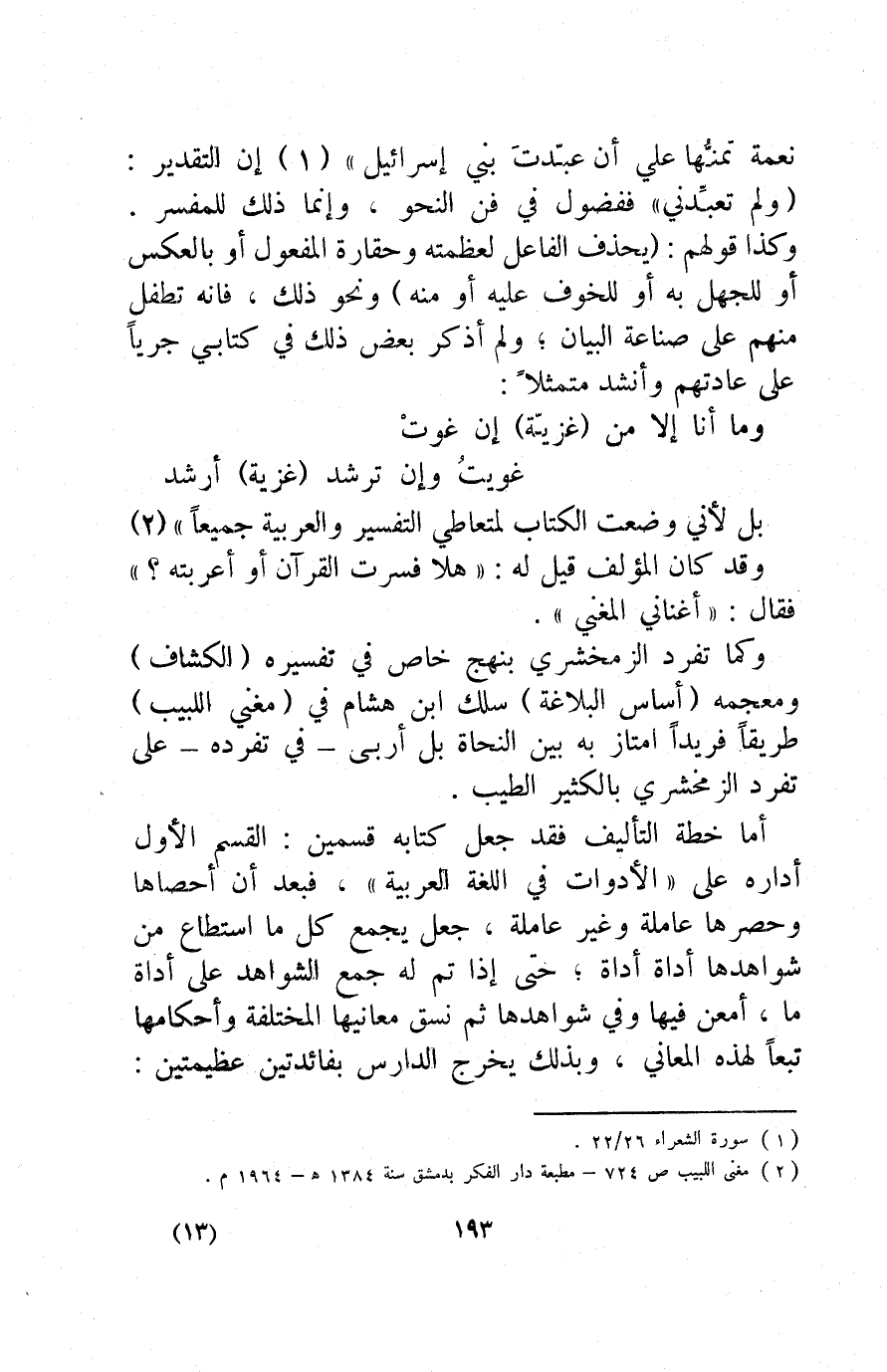نِعْمَةٌ تَمُنُّهَا عَلَيَّ أَنْ عَبَّدْتَ بَنِي إِسْرَائِيلَ} 1: إن التقدير: "ولم تعبدني" ففضول في فن النحو، وإنما ذلك للمفسر. وكذا قولهم: "يحذف الفاعل لعظمته وحقارة المفعول أو بالعكس, أو للجهل به, أو للخوف عليه أو منه" ونحو ذلك، فإنه تطفل منهم على صناعة البيان؛ ولم أذكر بعض ذلك في كتابي جريا على عادتهم, وأنشد متمثلا: