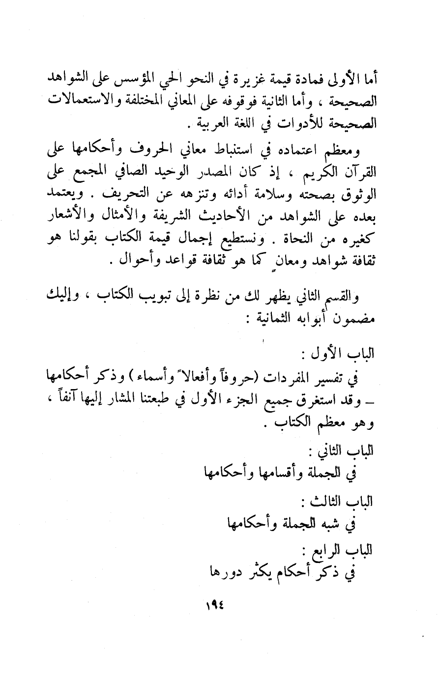 أما الأولى فمادة قيمة غزيرة في النحو الحي المؤسس على الشواهد الصحيحة، وأما الثانية فوقوفه على المعاني المختلفة والاستعمالات الصحيحة للأدوات في اللغة العربية.