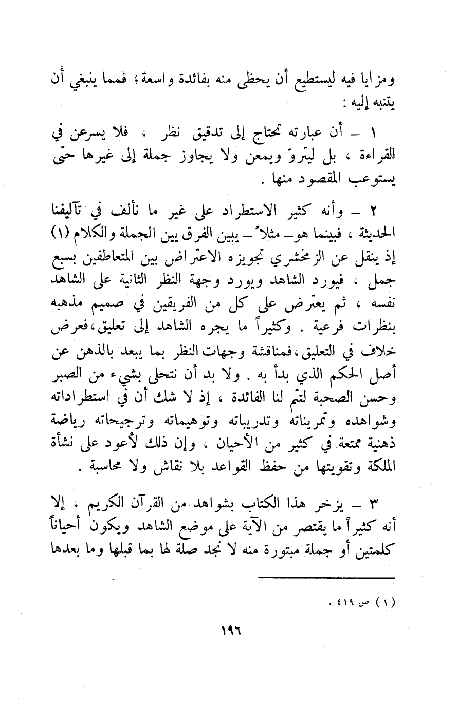 1- أن عبارته تحتاج إلى تدقيق نظر، فلا يسرعن في القراءة، بل ليتروَّ ويمعن ولا يجاوز جملة إلى غيرها حتى يستوعب المقصود منها.