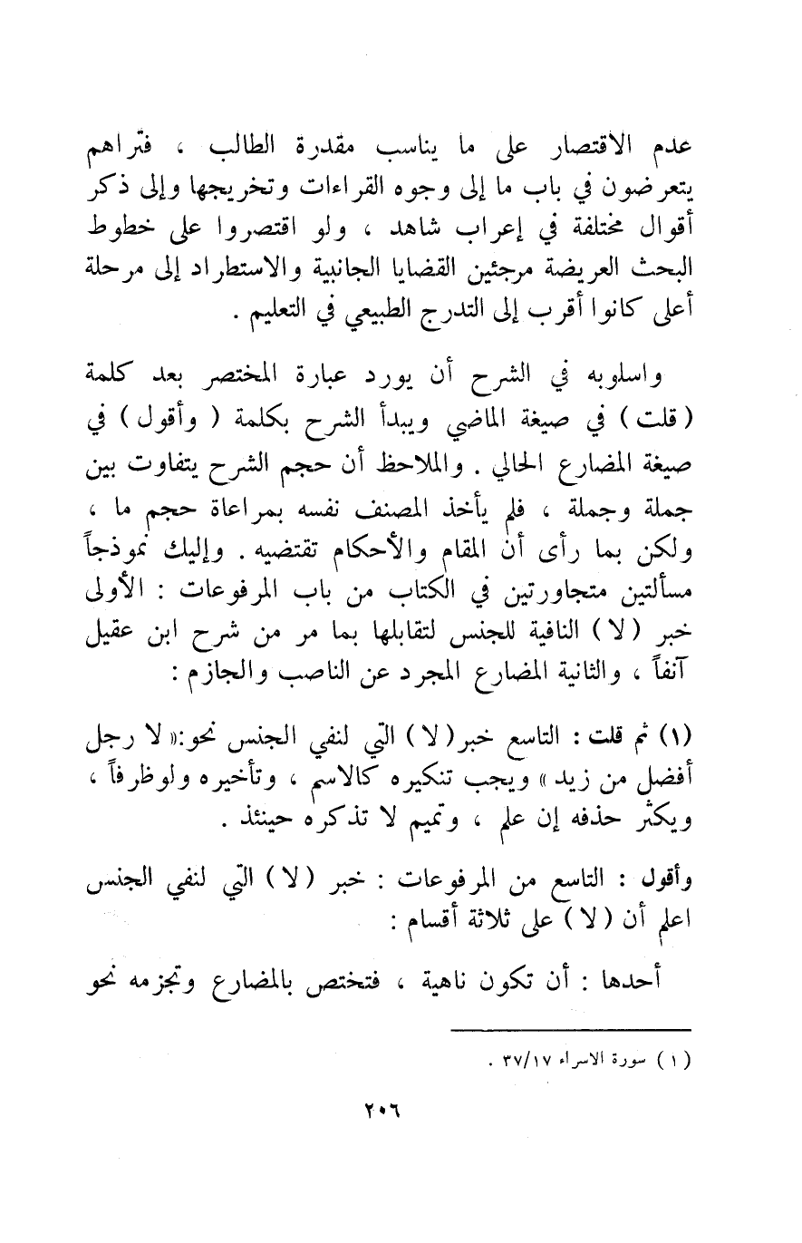 عدم الاقتصار على ما يناسب مقدرة الطالب، فتراهم يتعرضون في باب ما إلى وجوه القراءات وتخريجها, وإلى ذكر أقوال مختلفة في إعراب شاهد، ولو اقتصروا على خطوط البحث العريضة مرجئين القضايا الجانبية والاستطراد إلى مرحلة أعلى كانوا أقرب إلى التدرج الطبيعي في التعليم.