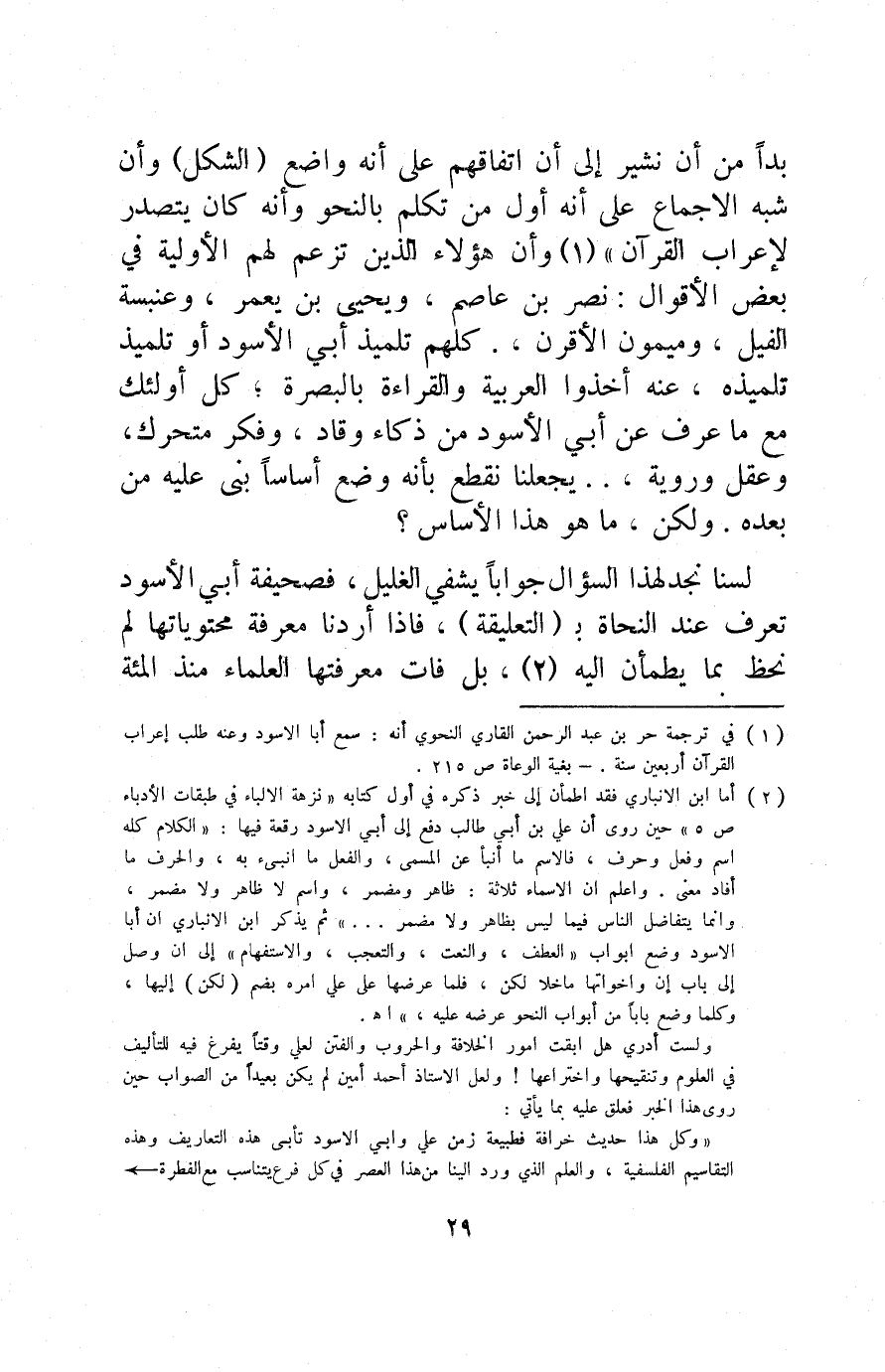 "وكل هذا حديث خرافة, فطبيعة زمن علي وأبي الأسود تأبى هذه التعاريف وهذه التقاسيم الفلسفية، والعلم الذي ورد إلينا من هذا العصر في كل فرع يتناسب مع الفطرة =