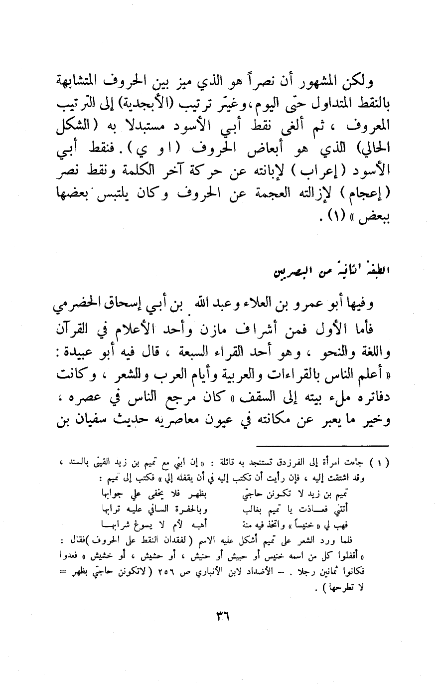 ولكن المشهور أن نصرا هو الذي ميز بين الحروف المتشابهة بالنقط المتداول حتى اليوم، وغيّر ترتيب "الأبجدية" إلى الترتيب المعروف، ثم ألغى نقط أبي الأسود مستبدلا به "الشكل الحالي" الذي هو أبعاض الحروف "اوي". فنقط أبي الأسود "إعراب" لإبانته عن حركة آخر الكلمة, ونقط نصر "إعجام" لإزالته العجمة عن الحروف وكان يلتبس بعضها ببعض1.