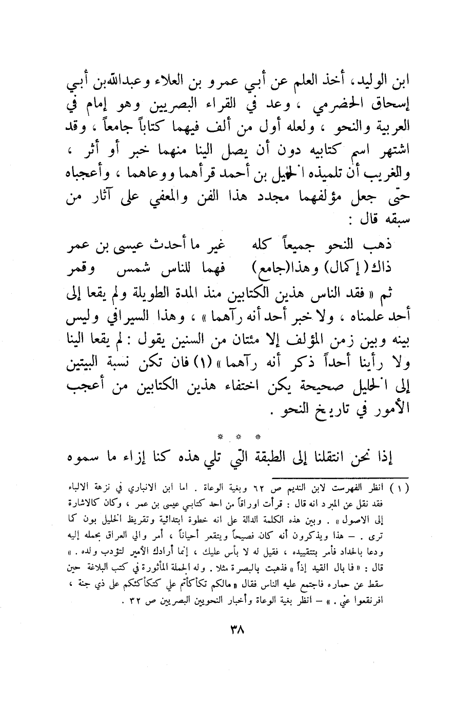 ثم "فقد الناس هذين الكتابين منذ المدة الطويلة ولم يقعا إلى أحد علمناه، ولا خبر أحد أنه رآهما"، وهذا السيرافي وليس بينه وبين زمن المؤلف إلا مائتان من السنين يقول: "لم يقعا إلينا ولا رأينا أحدا ذكر أنه رآهما"1 فإن تكن نسبة البيتين إلى الخليل صحيحة, يكن اختفاء هذين الكتابين من أعجب الأمور في تاريخ النحو.