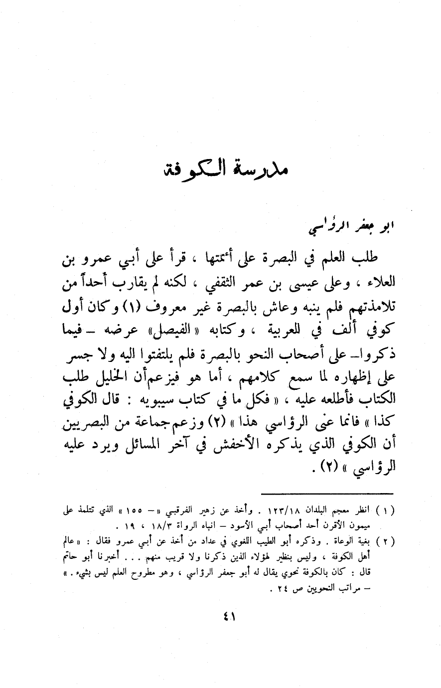 2 بغية الوعاة, وذكره أبو الطيب اللغوي في عداد من أخذ عن أبي عمرو فقال: "عالم أهل الكوفة، وليس بنظير لهؤلاء الذين ذكرنا ولا قريب منهم.... أخبرنا أبو حاتم قال: كان بالكوفة نحوي يقال له: أبو جعفر الرؤاسي، وهو مطروح العلم ليس بشيء" مراتب التحويين ص24.