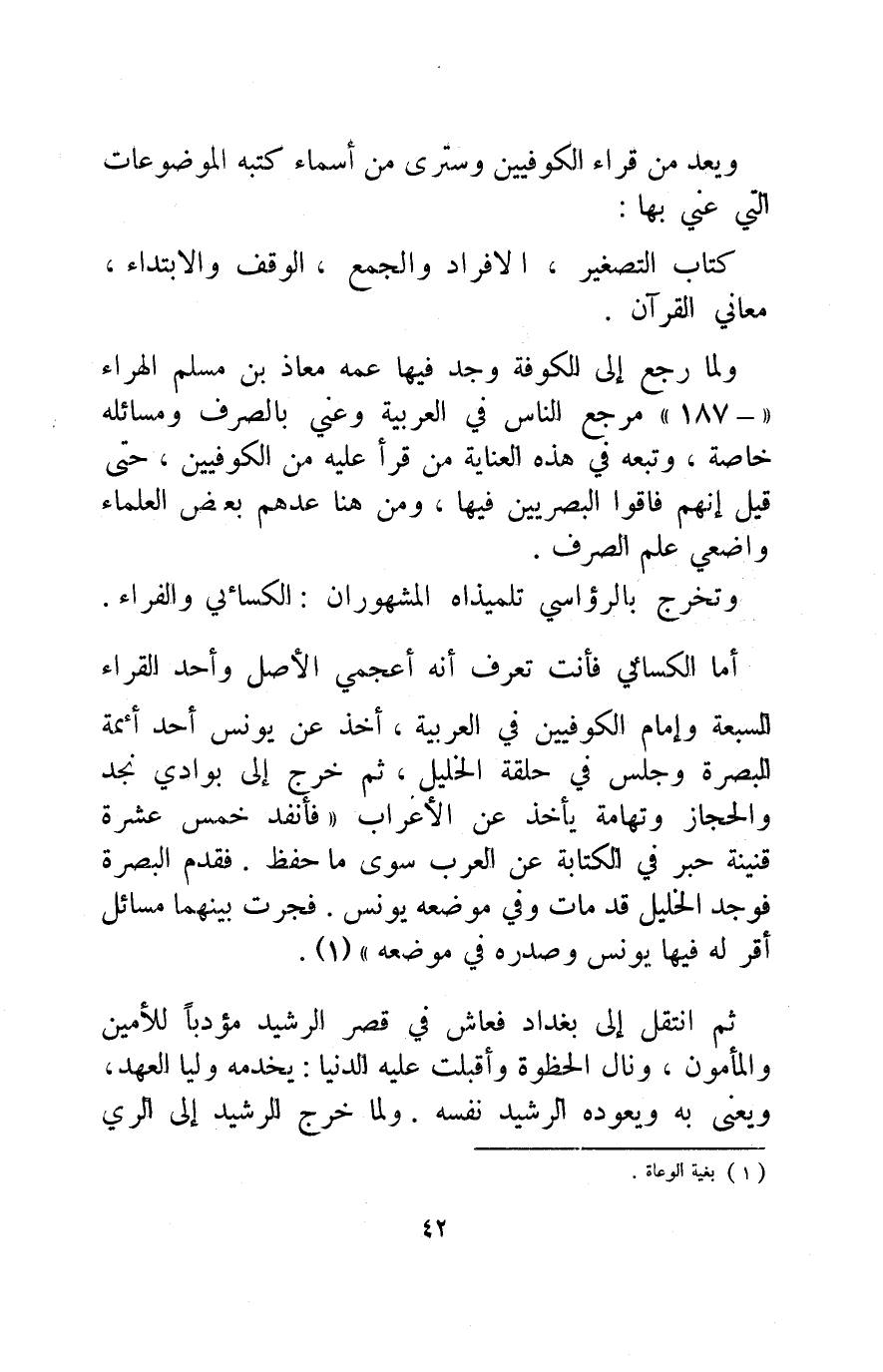 أما الكسائي فأنت تعرف أنه أعجمي الأصل وأحد القراء السبعة وإمام الكوفيين في العربية، أخذ عن يونس أحد أئمة البصرة وجلس في حلقة الخليل، ثم خرج إلى بوادي نجد والحجاز وتهامة يأخذ عن الأعراب "فأنفد خمس عشرة قنينة حبر في الكتابة عن العرب سوى ما حفظ, فقدم البصرة فوجد الخليل قد مات وفي موضعه يونس, فجرت بينهما مسائل أقر له فيها يونس وصدره في موضعه"1.