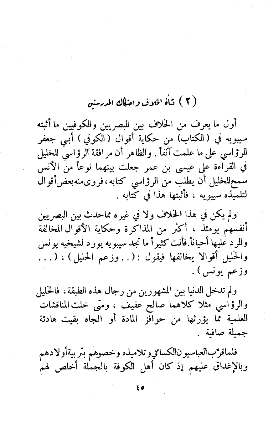 ولم يكن في هذا الخلاف ولا في غيره مما حدث بين البصريين أنفسهم يومئذ، أكثر من المذاكرة وحكاية الأقوال المخالفة والرد عليها أحيانا. فأنت كثيرا ما تجد سيبويه يورد لشيخيه يونس والخليل أقوالا يخالفها فيقول: "وزعم الحليل"، "وزعم يونس".