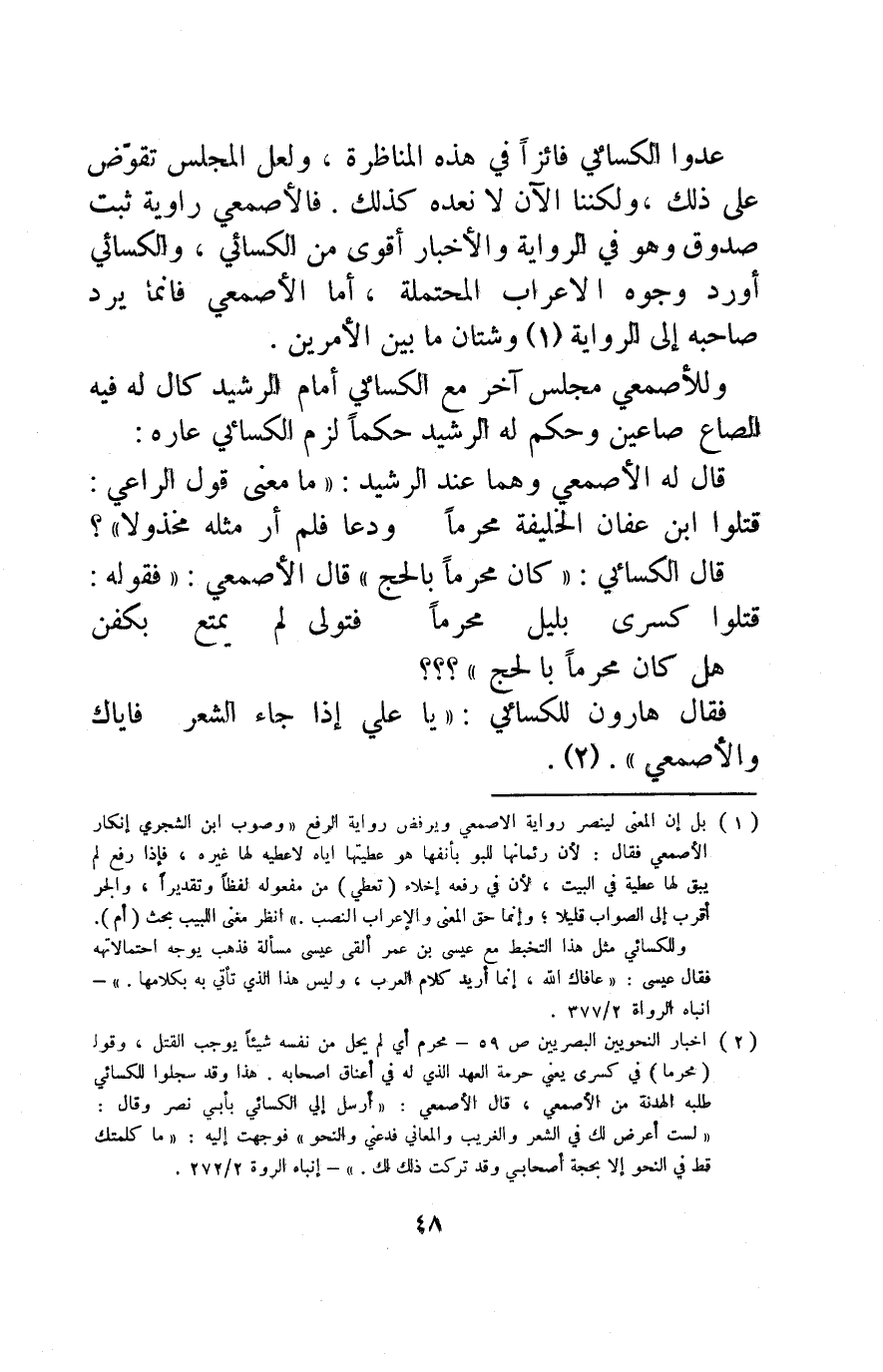 2 أخبار النحويين البصريين ص59, محرم أي: لم يحل من نفسه شيئا يوجب القتل، وقوله "محرما" في كسري يعني حرمة العهد الذي له في أعناق أصحابه. هذا وقد سجلوا للكسائي طلبه الهدنة من الأصمعي، قال الأصمعي: أرسل إلي الكسائي بأبي نصر وقال: "لست أعرض لك في الشعر والغريب والمعاني, فدعني والنحو" فوجهت إليه: "ما كلمتك قط في النحو إلا بحجة أصحابي, وقد تركت ذلك لك" إنباه الرواة 2/ 272.