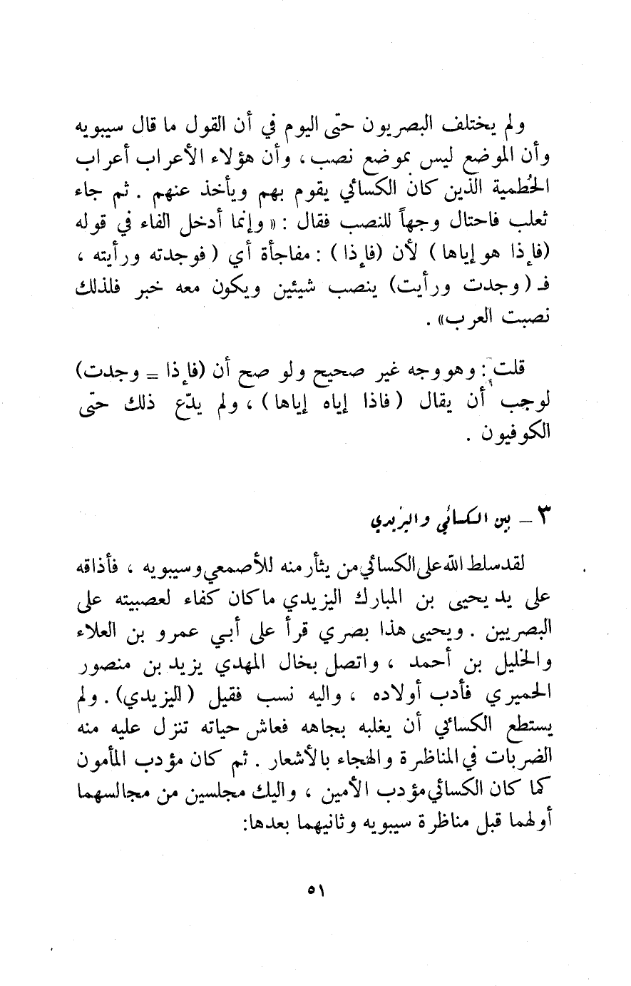 ولم يختلف البصريون حتى اليوم في أن القول ما قال سيبويه, وأن الموضع ليس بموضع نصب، وأن هؤلاء الأعراب أعراب الحطمية الذين كان الكسائي يقوم بهم ويأخذ عنهم. ثم جاء ثعلب فاحتال وجها للنصب فقال: "وإنما أدخل الفاء في قوله: "فإذا هو إياها" لأن "فإذا" مفاجأة أي: فوجدته ورأيته، فـ "وجدت ورأيت" ينصب شيئين ويكون معه خبر؛ فلذلك نصبت العرب".