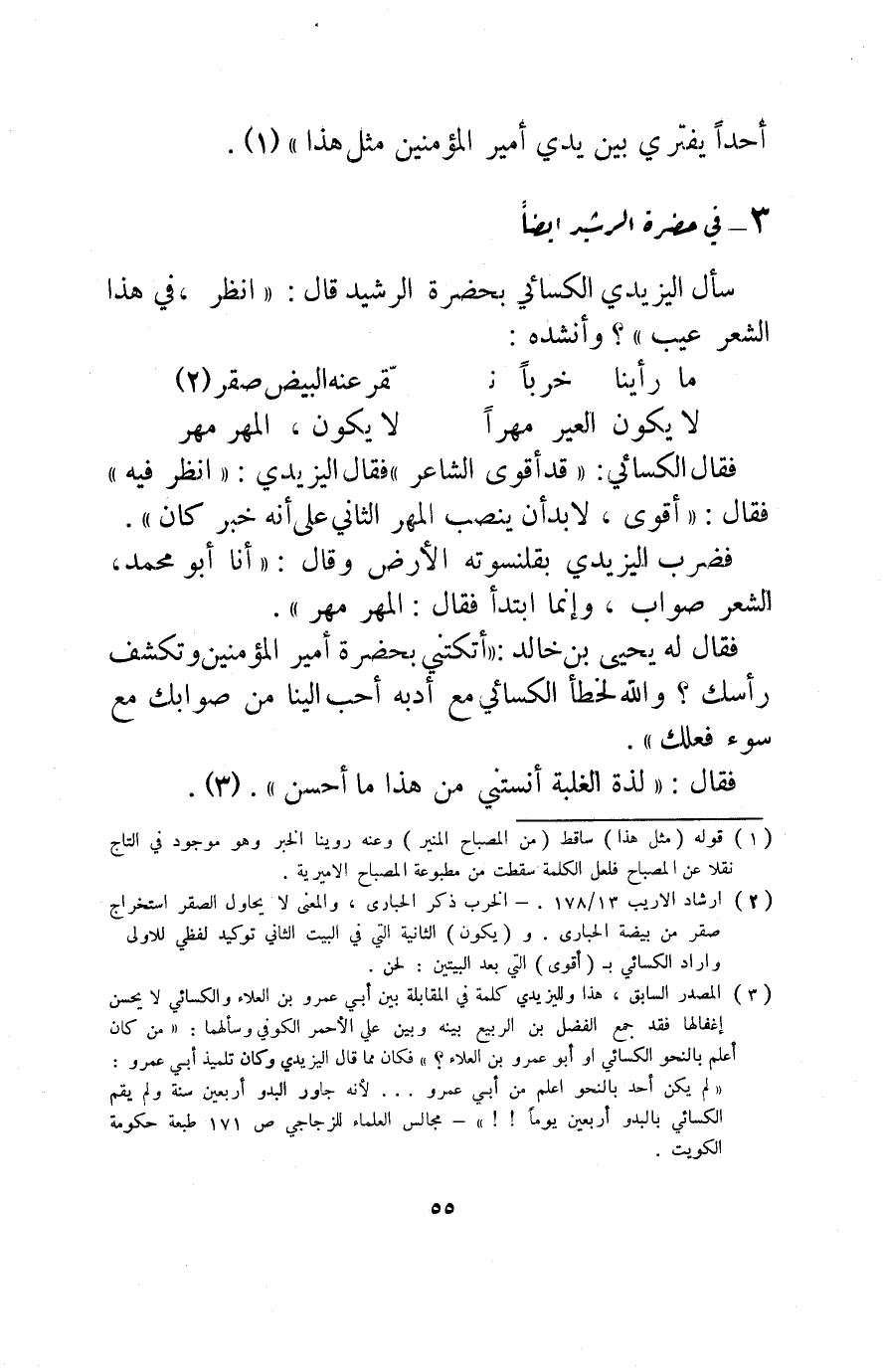 3 المصدر السابق، هذا ولليزيدي كلمة في المقابلة بين أبي عمرو بن العلاء والكسائي لا يحسن إغفالها, فقد جمع الفضل بن الربيع بينه وبين علي الأحمر الكوفي وسألهما: "من كان أعلم بالنحو: الكسائي أو أبو عمرو بن العلاء؟ " فكان مما قال اليزيدي وكان تلميذ أبي عمرو: "لم يكن أحد بالنحو أعلم من أبي عمرو؛ لأنه جاور البدو أربعين سنة ولم يقم الكسائي بالبدو أربعين يوما!! " مجالس العلماء للزجاجي ص171 طبعة حكومة الكويت.