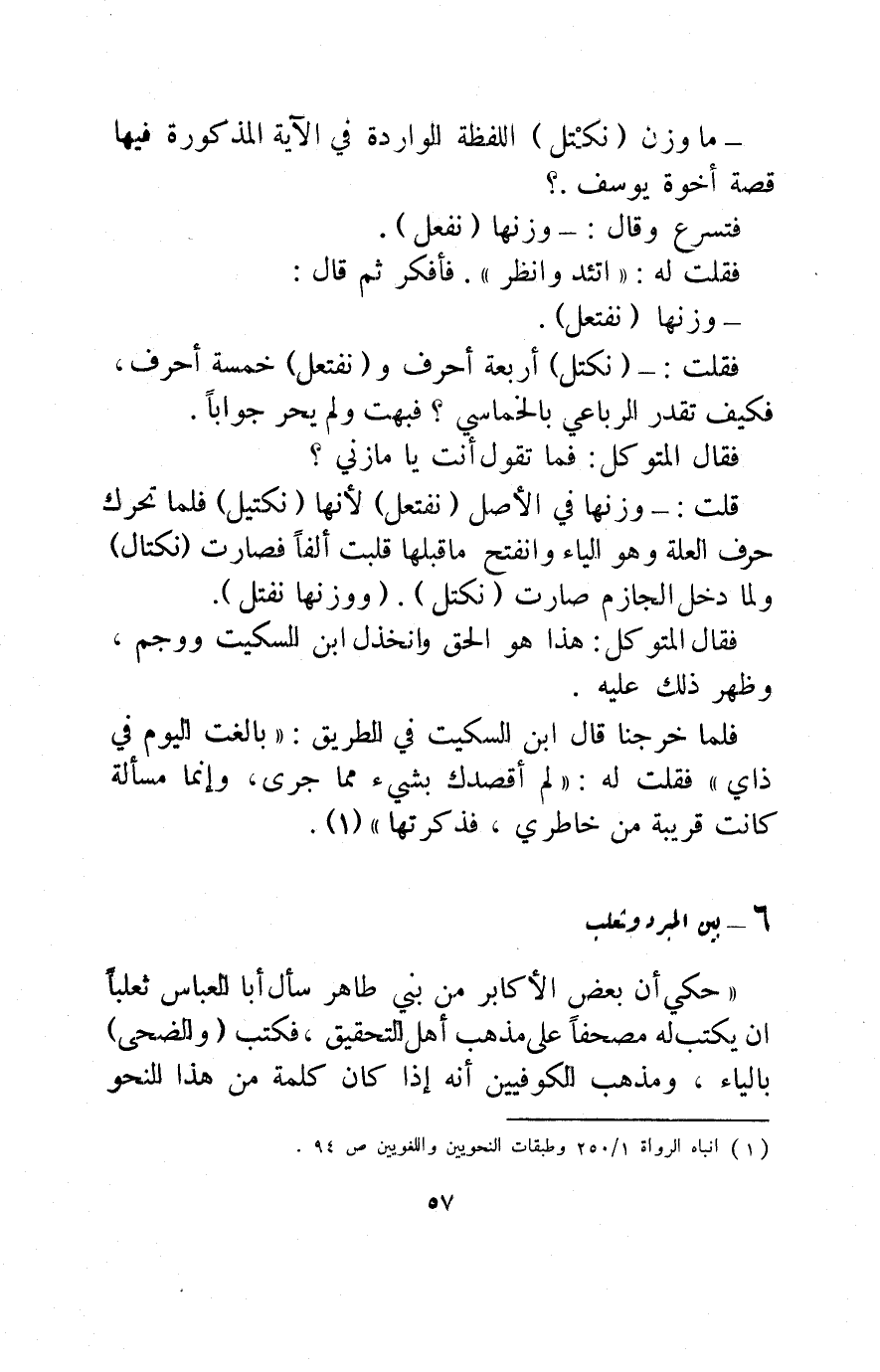 فقلت: "نكتل" أربعة أحرف و"نفتعل" خمسة أحرف، فكيف تقدر الرباعي بالخماسي؟ فبهت ولم يحر جوابا.