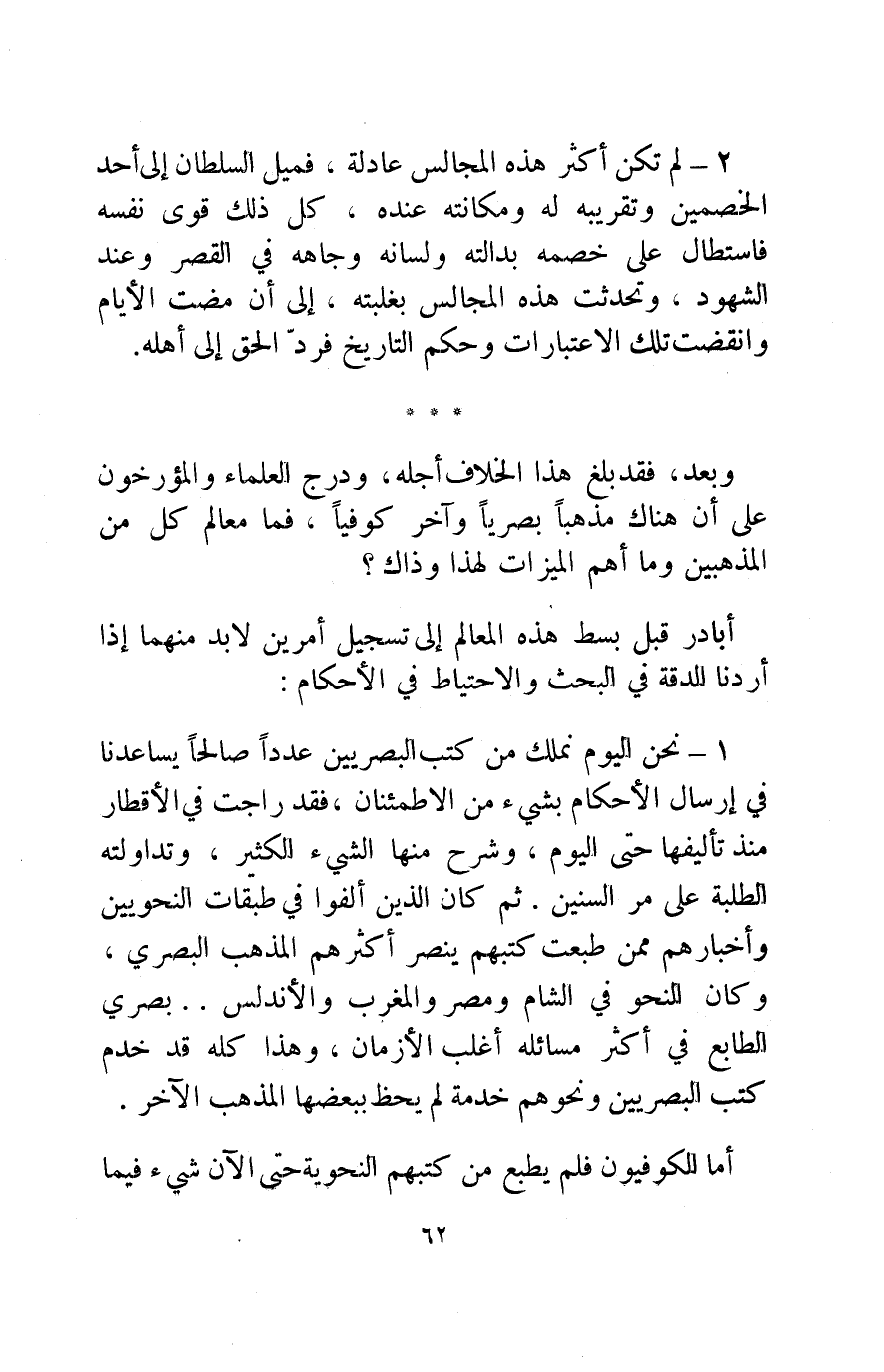 وبعد، فقد بلغ هذا الخلاف أجله، ودرج العلماء والمؤرخون على أن هناك مذهبا بصريا وآخر كوفيا، فما معالم كل من المذهبين. وما أهم الميزات لهذا وذاك؟