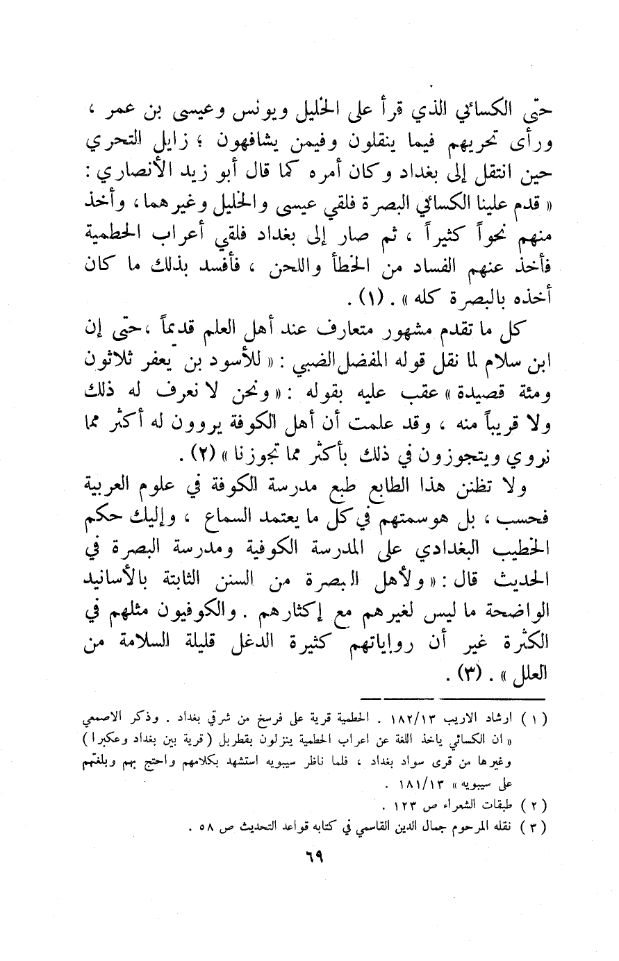 1 إرشاد الأريب 13/ 182. الحطمية: قرية على فرسخ من شرقي بغداد، وذكر الأصمعي "أن الكسائي يأخذ اللغة عن أعراب الحطمية, ينزلون بقطربل "قرية بين بغداد وعكبرا" وغيرها من قرى سواد بغداد، فلما ناظر سيبويه استشهد بكلامهم, واحتج بهم وبلغتهم على سيبويه" 13/ 181.