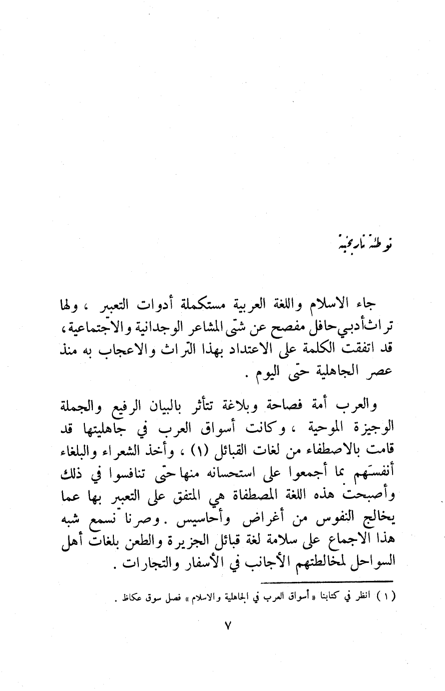 والعرب أمة فصاحة وبلاغة تتأثر بالبيان الرفيع والجملة الوجيزة الموحية، وكانت أسواق العرب في جاهليتها قد قامت بالاصطفاء من لغات القبائل1، وأخذ الشعراء والبلغاء أنفسهم بما أجمعوا على استحسانه منها حتى تنافسوا في ذلك وأصبحت هذه اللغة المصطفاة هي المتفق على التعبير بها عما يخالج النفوس من أغراض وأحاسيس. وصرنا نسمع شبه هذا الإجماع على سلامة لغة قبائل الجزيرة والطعن بلغات أهل السواحل؛ لمخالطتهم الأجانب في الأسفار والتجارات.