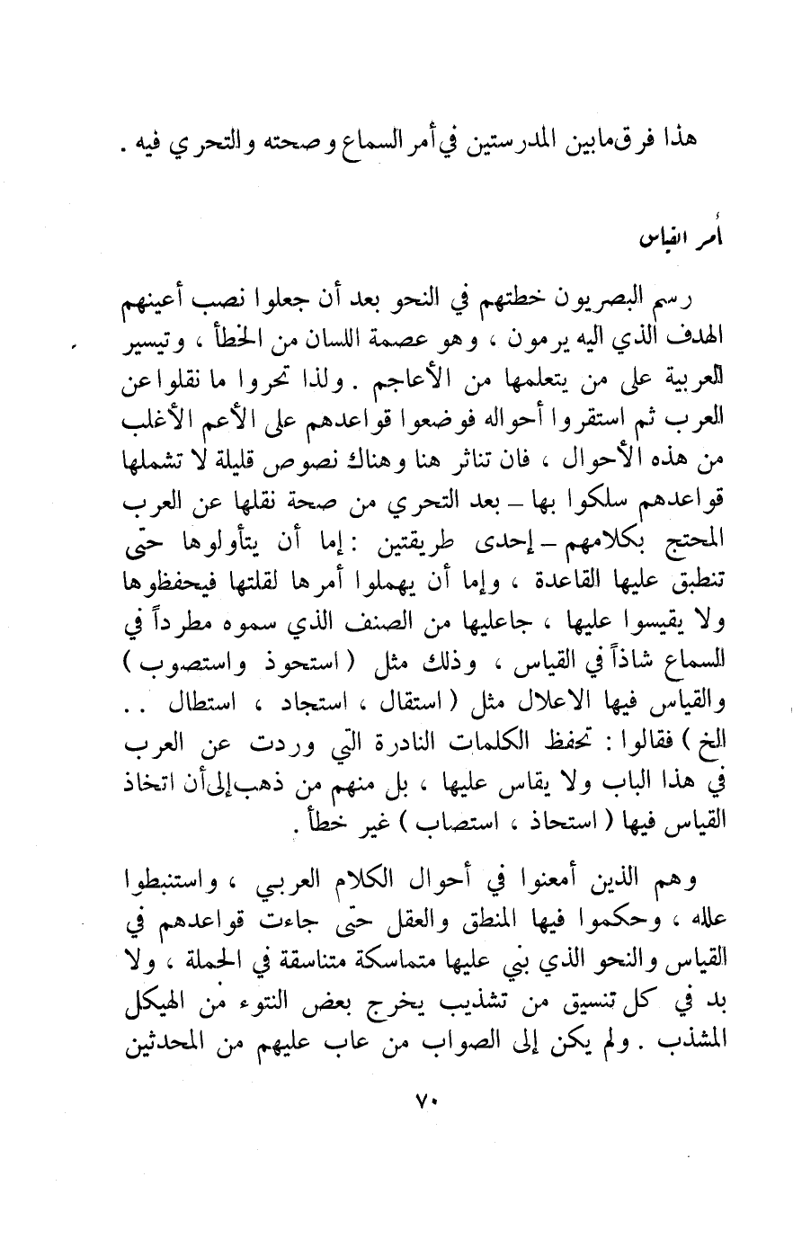 وهم الذين أمعنوا في أحوال الكلام العربي، واستنبطوا علله، وحكموا فيها المنطق والعقل حتى جاءت قواعدهم في القياس والنحو الذي بني عليها متماسكة متناسقة في الجملة، ولا بد في كل تنسيق من تشذيب يخرج بعض النتوء من الهيكل المشذب. ولم يكن إلى الصواب من عاب عليهم من المحدثين