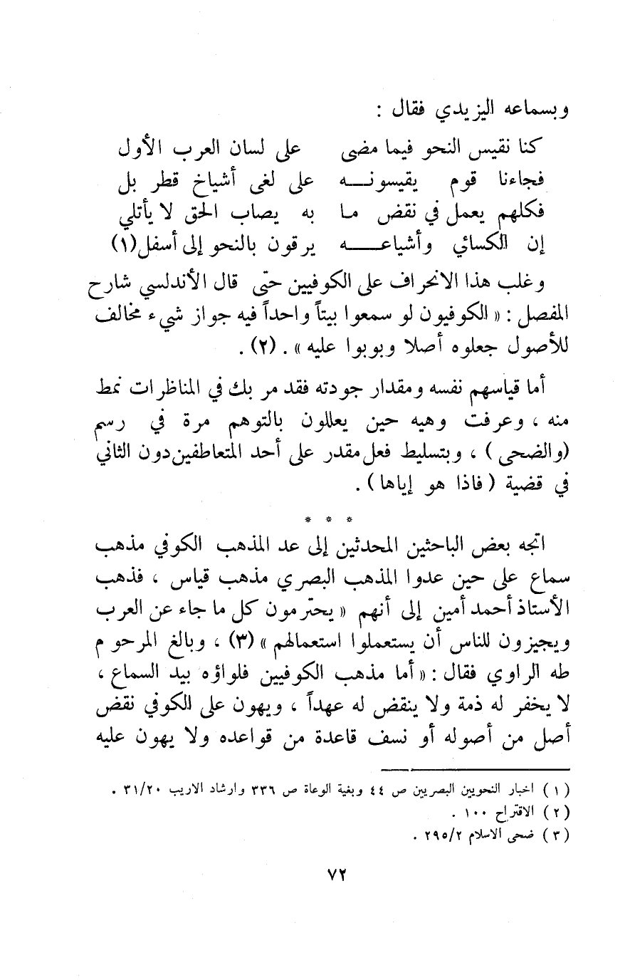 اتجه بعض الباحثين المحدثين إلى عد المذهب الكوفي مذهب سماع, على حين عدوا المذهب البصري مذهب قياس، فذهب الأستاذ أحمد أمين إلى أنهم "يحترمون كل ما جاء عن العرب, ويجيزون للناس أن يستعملوا استعمالهم"3، وبالغ المرحوم طه الراوي فقال: "أما مذهب الكوفيين فلواؤه بيد السماع، لا يخفر له ذمة ولا ينقض له عهدا، ويهون على الكوفي نقض أصل من أصوله أو نسف قاعدة من قواعده ولا يهون عليه