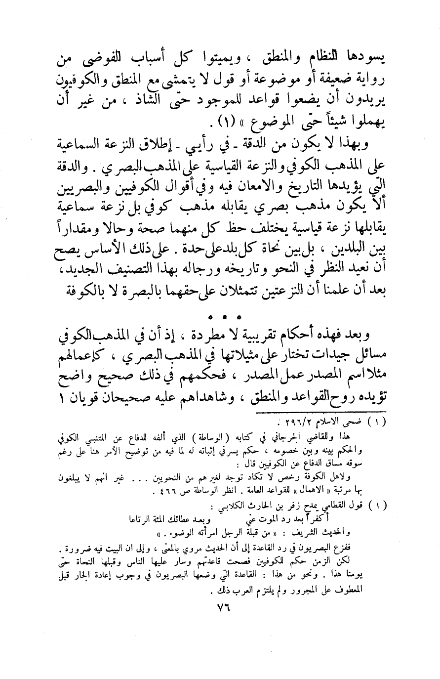 وبهذا لا يكون من الدقة -في رأيي- إطلاق النزعة السماعية على المذهب الكوفي, والنزعة القياسية على المذهب البصري. والدقة التي يؤيدها التاريخ والإمعان فيه وفي أقوال الكوفيين والبصريين ألا يكون مذهب بصري يقابله مذهب كوفي, بل نزعة سماعية يقابلها نزعة قياسية يختلف حظ كل منهما صحة وحالا ومقدارا بين البلدين، بل بين نحاة كل بلد على حدة. على ذلك الأساس يصح أن نعيد النظر في النحو وتاريخه ورجاله بهذا التصنيف الجديد، بعد أن علمنا أن النزعتين تتمثلان على حقهما بالبصرة لا بالكوفة.