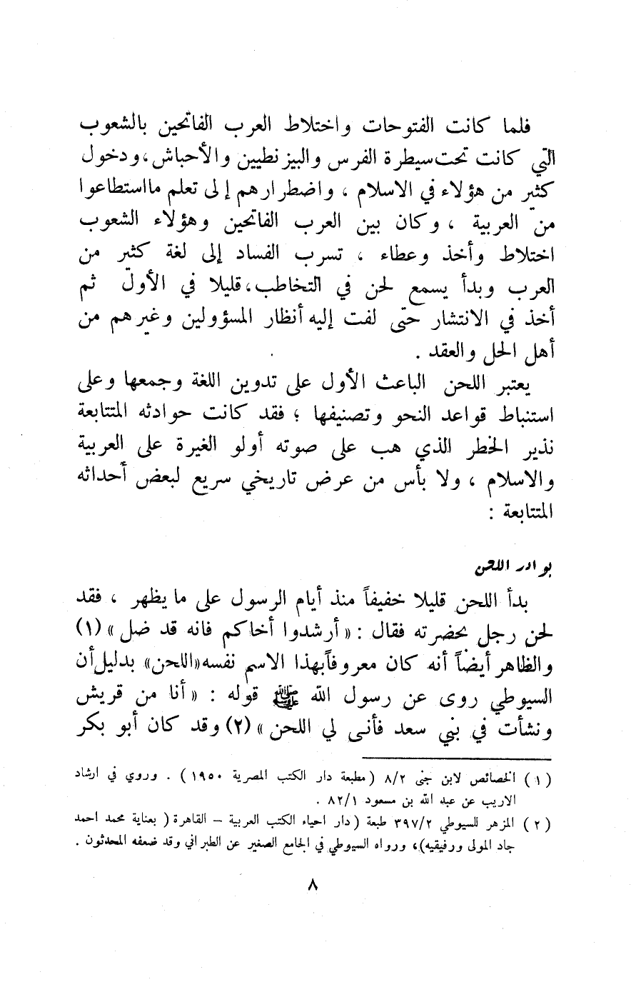 بدأ اللحن قليلا خفيفا منذ أيام الرسول على ما يظهر، فقد لحن رجل بحضرته فقال: "أرشدوا أخاكم؛ فإنه قد ضل" 1 والظاهر أيضا أنه كان معروفا بهذا الاسم نفسه "اللحن" بدليل أن السيوطي روى عن رسول الله -صلى الله عليه وسلم- قوله: "أنا من قريش ونشأت في بني سعد, فأنى لي اللحن"2 وقد كان أبو بكر