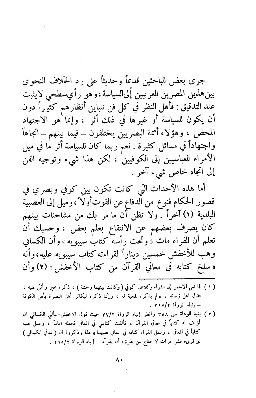 أما هذه الأحداث التي كانت تكون بين كوفي وبصري في قصور الحكام فنوع من الدفاع عن القوت أولا، وميل إلى العصبية البلدية1 آخرا. ولا تظن أن ما مر بك من مشاحنات بينهم كان يصرف بعضهم عن الانتفاع بعلم بعض، وحسبك أن تعلم أن الفراء مات "وتحت رأسه كتاب سيبويه" وأن الكسائي وهب للأخفش خمسين دينارا لقراءته كتاب سيبويه عليه، وأنه "سلخ كتابه في معاني القرآن من كتاب الأخفش"2 وأن