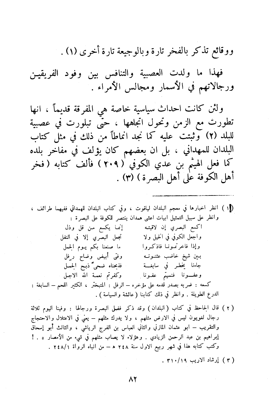 1 انظر أخبارها في معجم البلدان لياقوت، وفي كتاب البلدان للهمداني, ففيهما طرائف، وانظر على سبيل التمثيل أبيات أعشى همدان ينتصر للكوفة على البصرة: