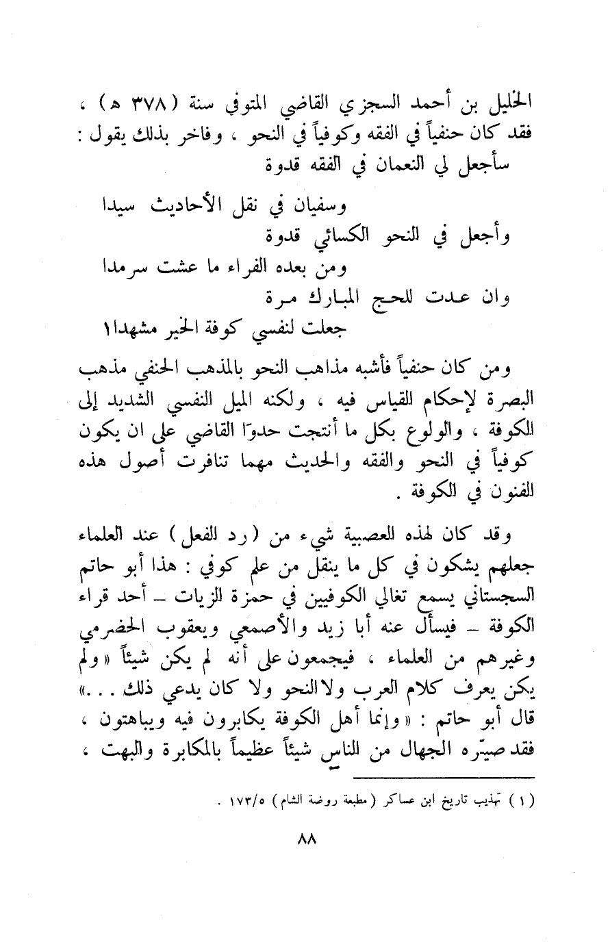 الخليل بن أحمد السجزي القاضي المتوفى سنة "378هـ" فقد كان حنفيا في الفقه وكوفيا في النحو، وفاخر بذلك يقول: