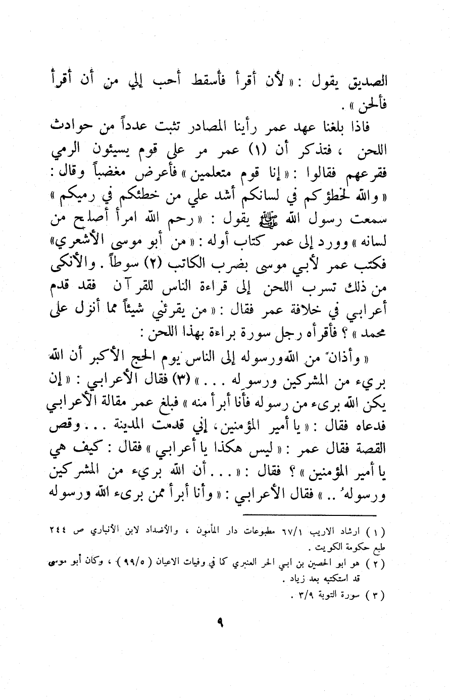 "وأذان من الله ورسوله إلى الناس يوم الحج الأكبر أن الله بريء من المشركين ورسولِهِ ... "3 فقال الأعرابي: "إن يكن الله بريئا من رسوله, فأنا أبرأ منه" فبلغ عمر مقالة الأعرابي فدعاه فقال: يا أمير المؤمنين, إني قدمت المدينة ... وقص القصة فقال عمر: "ليس هكذا يا أعرابي" فقال: "كيف هي يا أمير المؤمنين؟ " فقال: {أن اللَّهَ بَرِيءٌ مِنَ الْمُشْرِكِينَ وَرَسُولُهُ} فقال الأعرابي: "وأنا أبرأ ممن برئ الله ورسوله