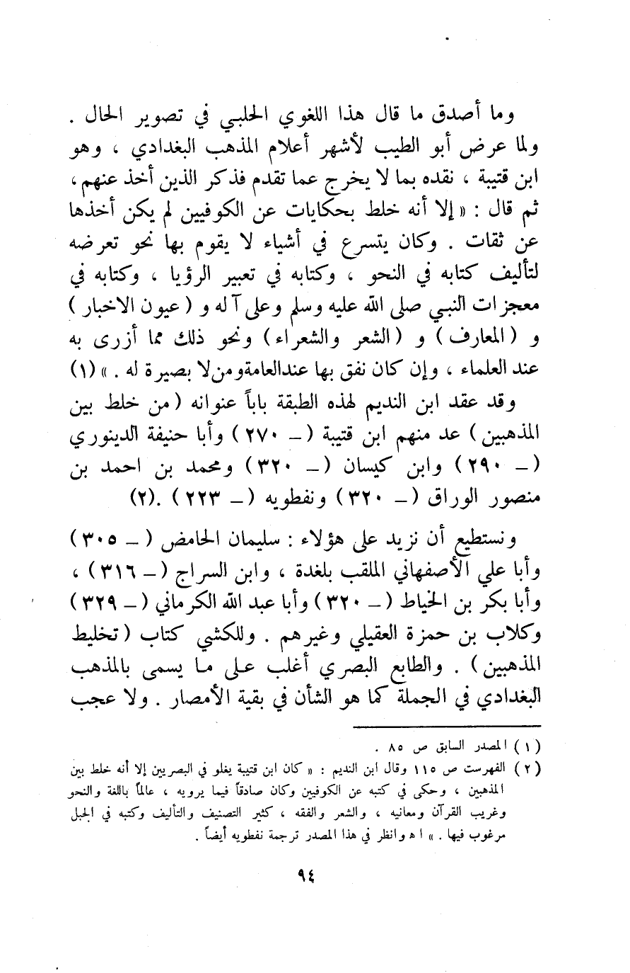 وقد عقد ابن النديم لهذه الطبقة بابا عنوانه "من خلط بين المذهبين" عد منهم ابن قتيبة "270" وأبا حنيفة الدينوري "290" وابن كيسان "320" ومحمد بن أحمد بن منصور الوراق "320" ونفطويه "233"2.