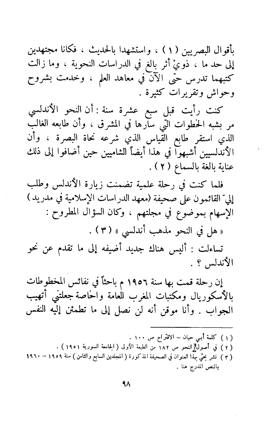 كنت رأيت قبل سبع عشرة سنة: أن النحو الأندلسي مر بشبه الخطوات التي سارها في المشرق، وأن طابعه الغالب الذي استقر طابع القياس الذي شرعه نحاة البصرة، وأن الأندلسيين أشبهوا في هذا أيضا الشاميين حين أضافوا إلى ذلك عناية بالغة بالسماع2.
